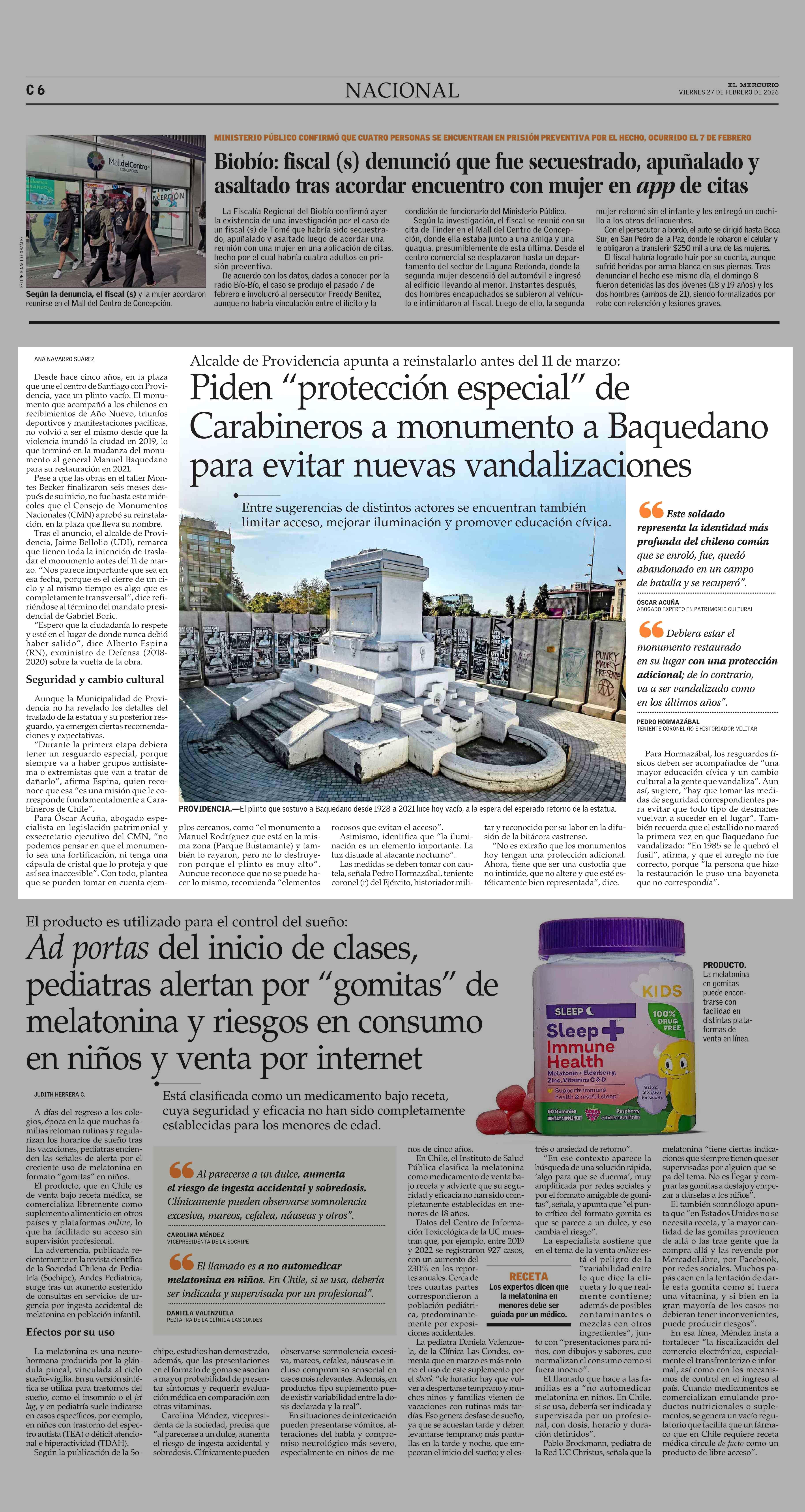 Piden “protección especial” de Carabineros a monumento a Baquedano para evitar nuevas vandalizaciones 27-02-2026 El Mercurio |