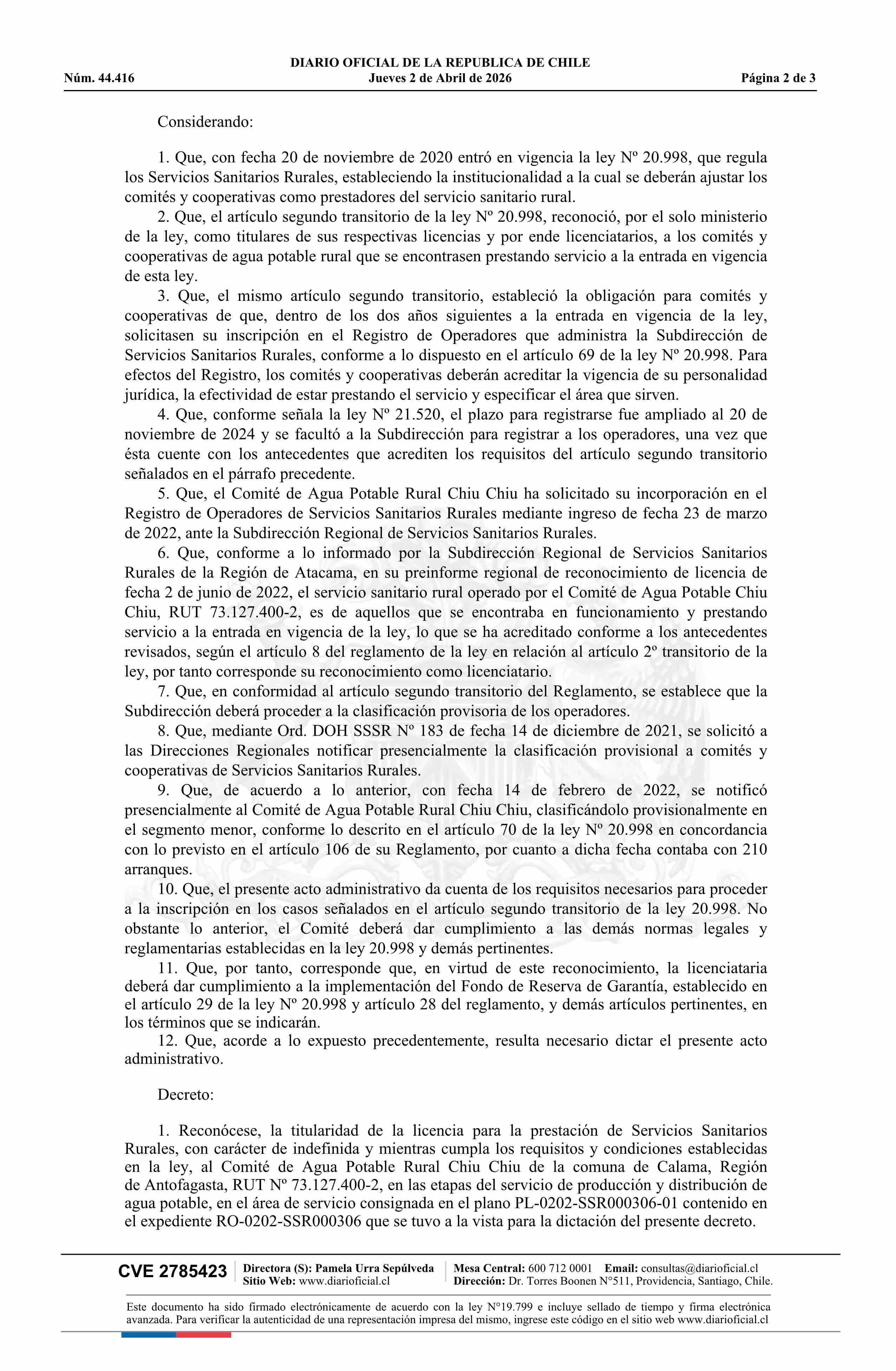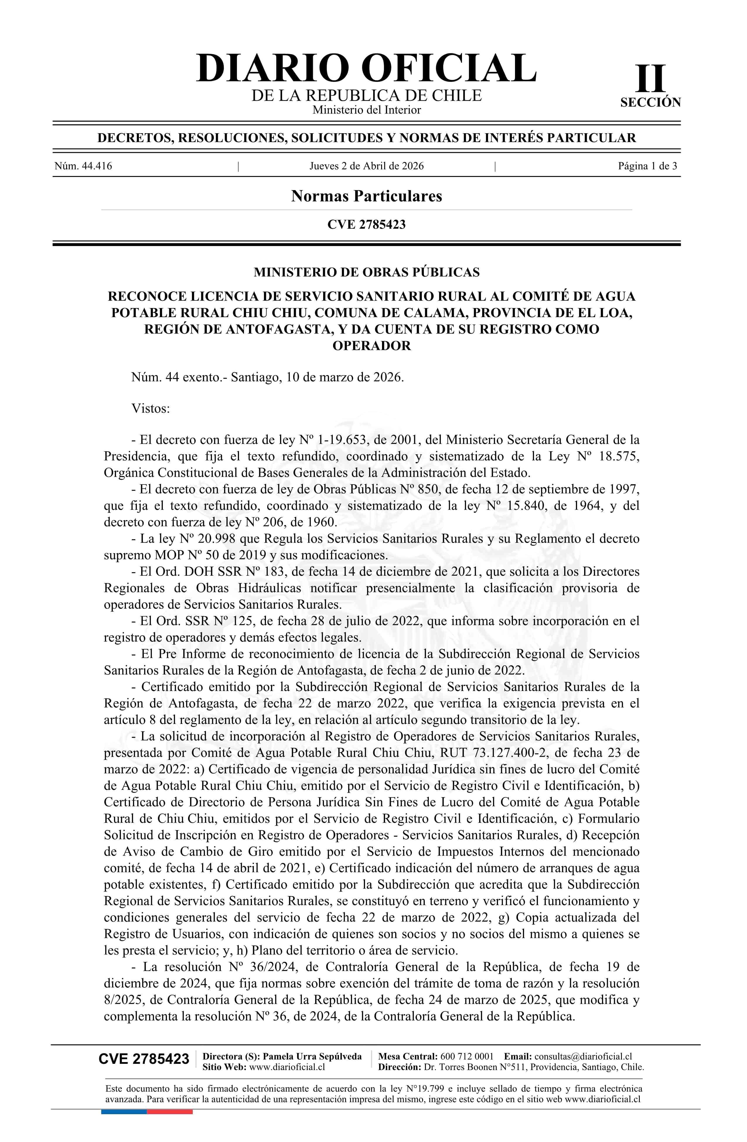 | Título: | Decreto exento número 44, de 2026.- Reconoce Licencia de Servicio Sanitario Rural al Comité de Agua Potable Rural Chiu Chiu, comuna de Calama, provincia de El Loa, Región de Antofagasta, y da cuenta de su registro como operador |