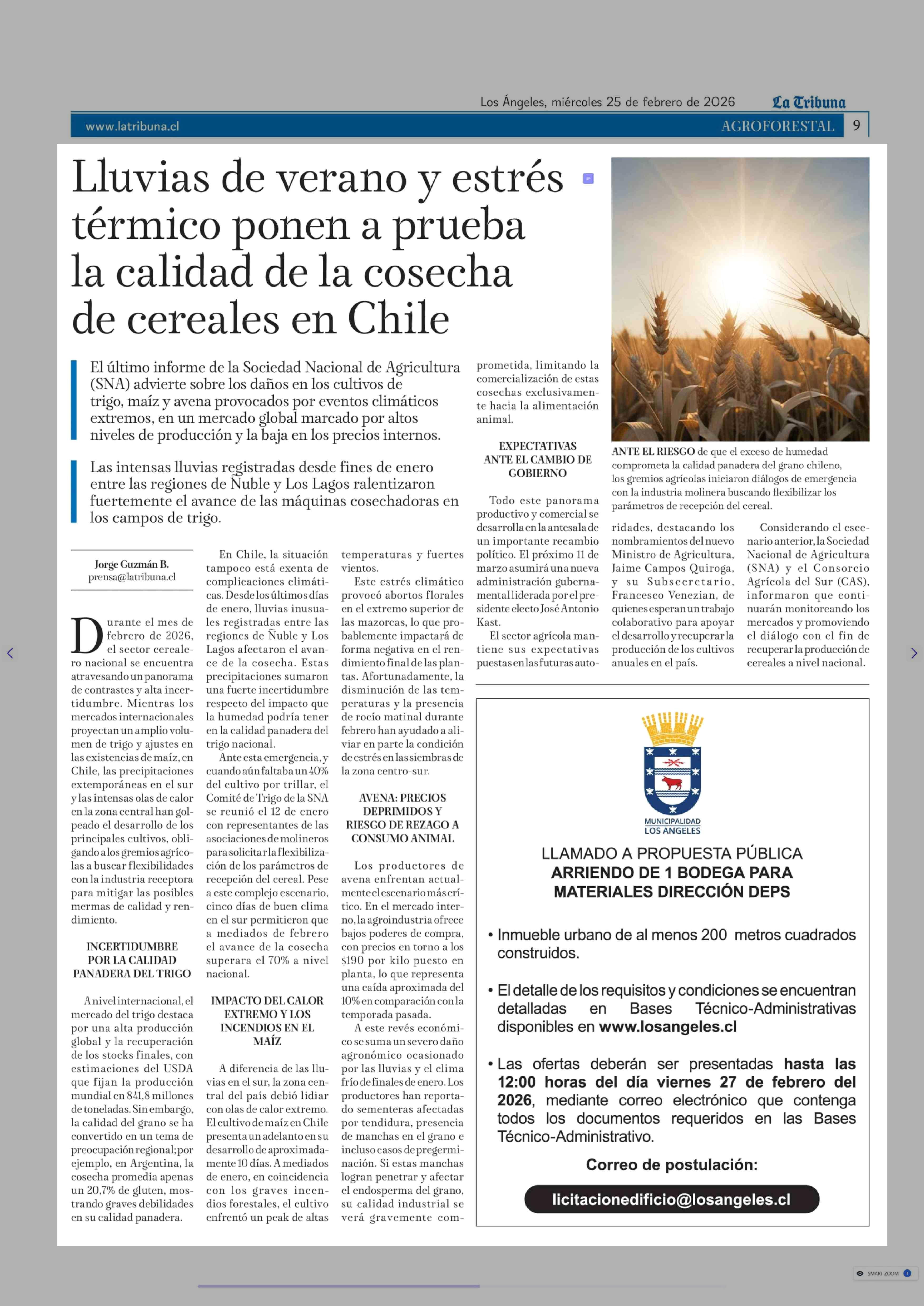 Título: Lluvias de verano y estrés térmico ponen a prueba la calidad de la cosecha de cereales en Chile