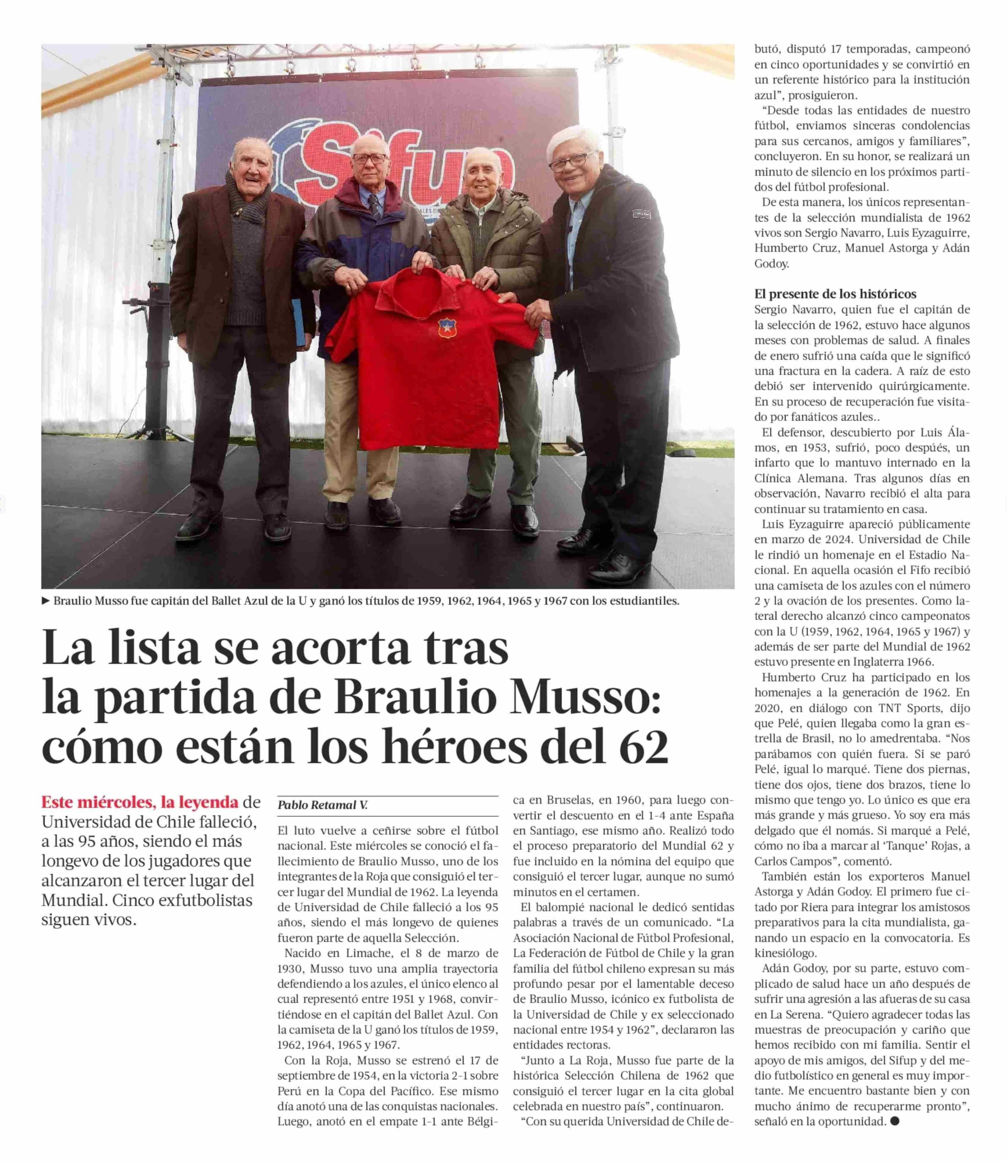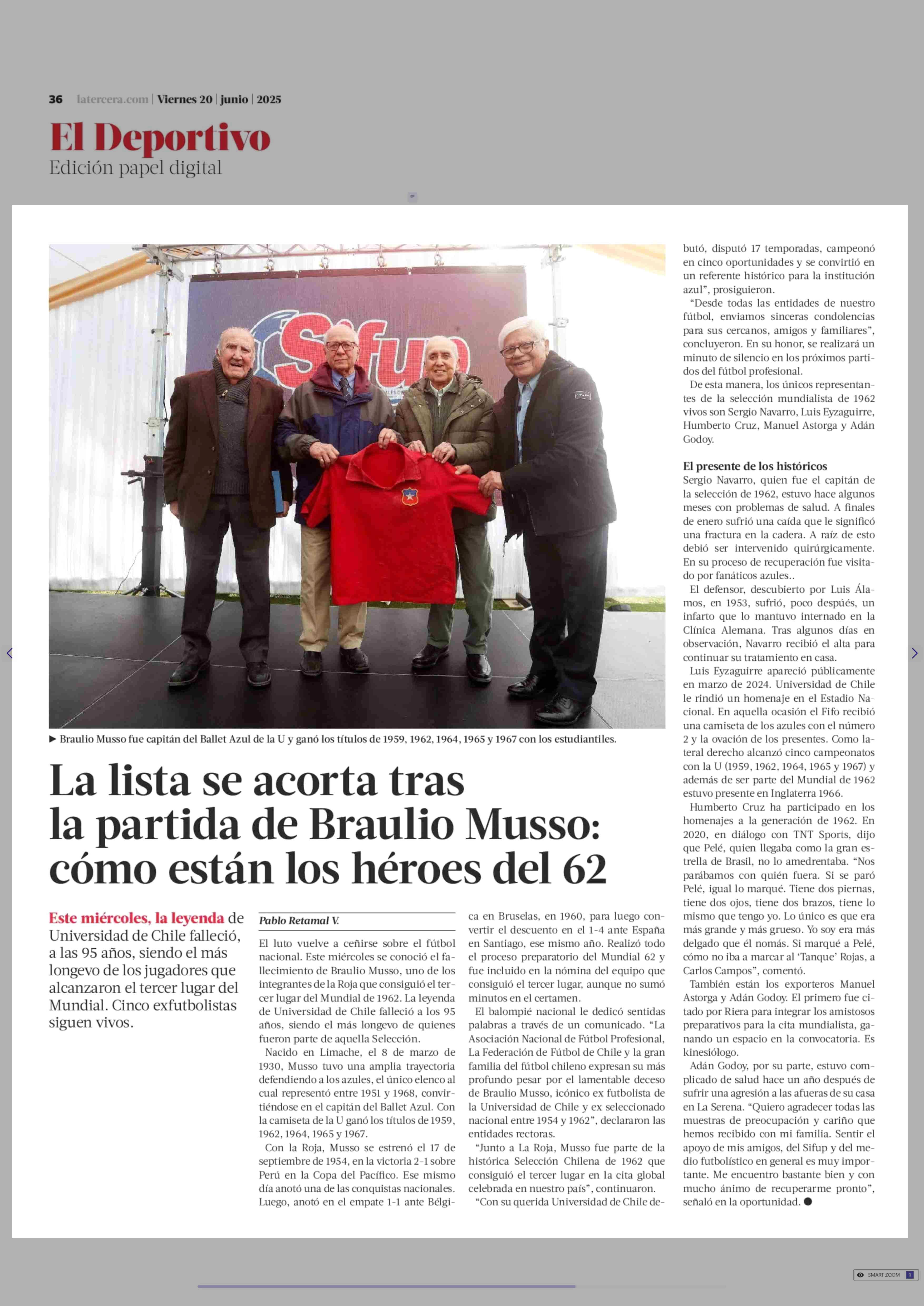 La lista se acorta tras la partida de Braulio Musso: cómo están los héroes del 62 20-06-2025 La Tercera |