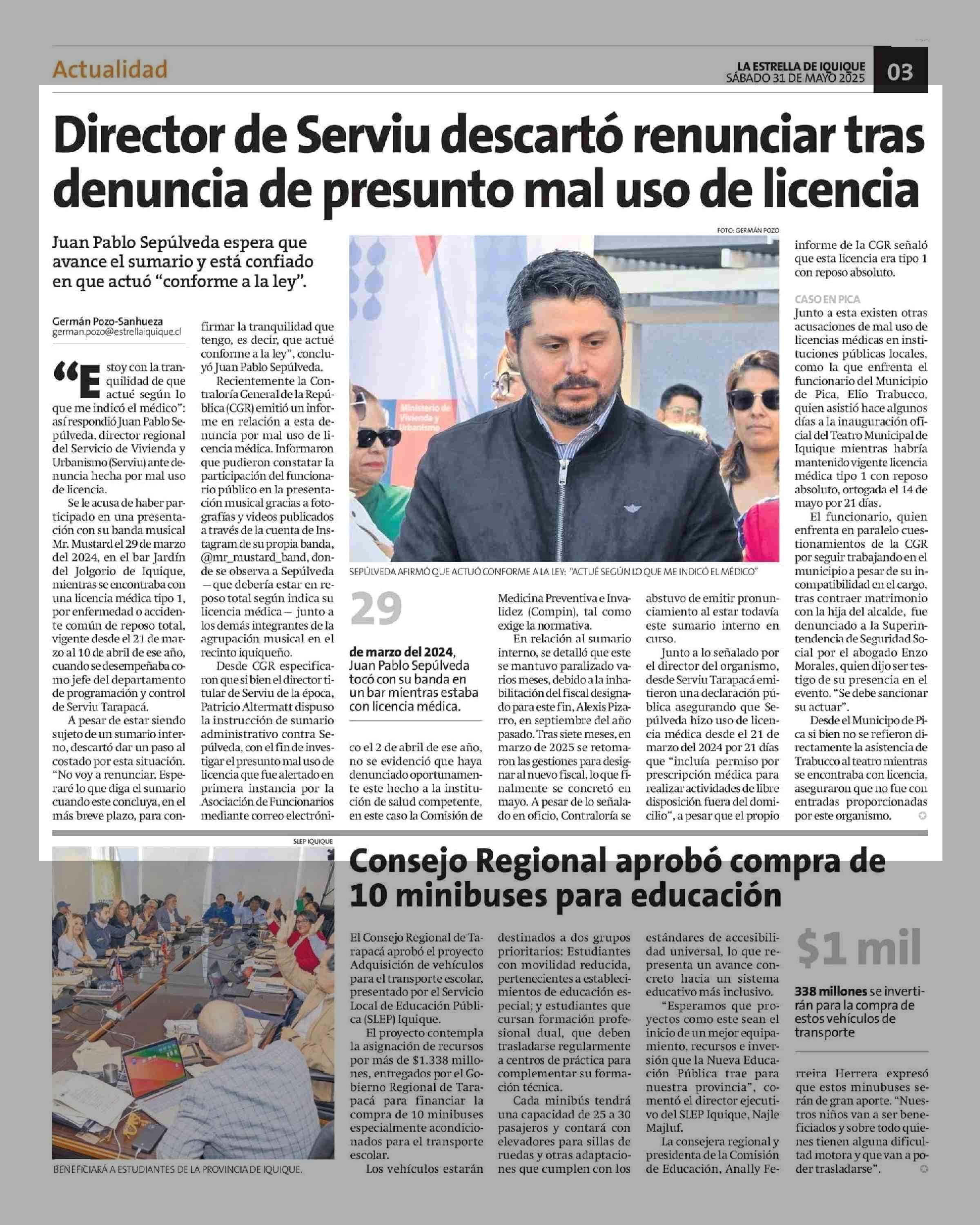 Director de Serviu descartó renunciar tras denuncia de presunto mal uso de licencia 31-05-2025 La Estrella de Iquique |