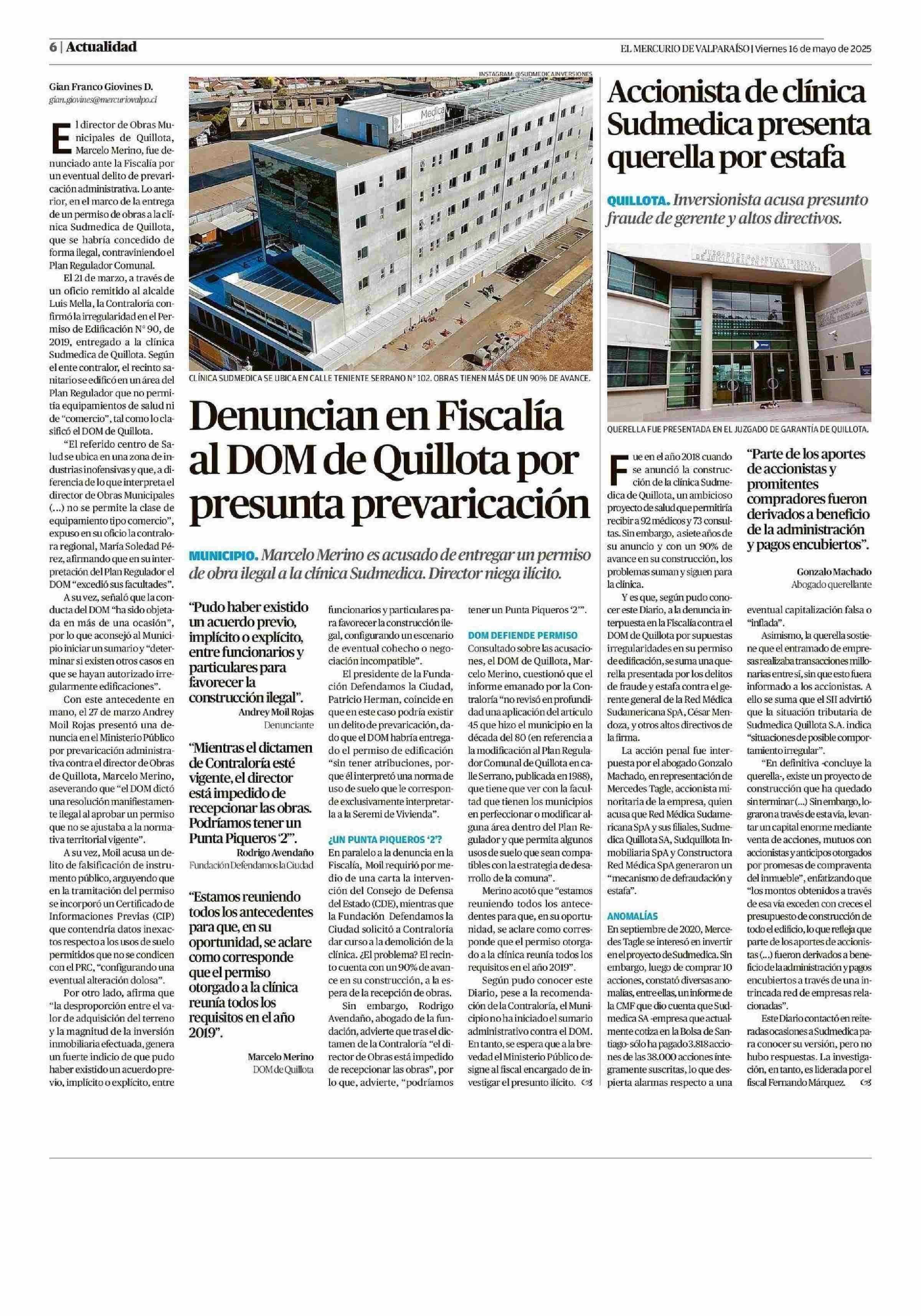 Denuncian en Fiscalía al DOM de Quillota por presunta prevaricación 16-05-2025 El Mercurio de Valparaíso |