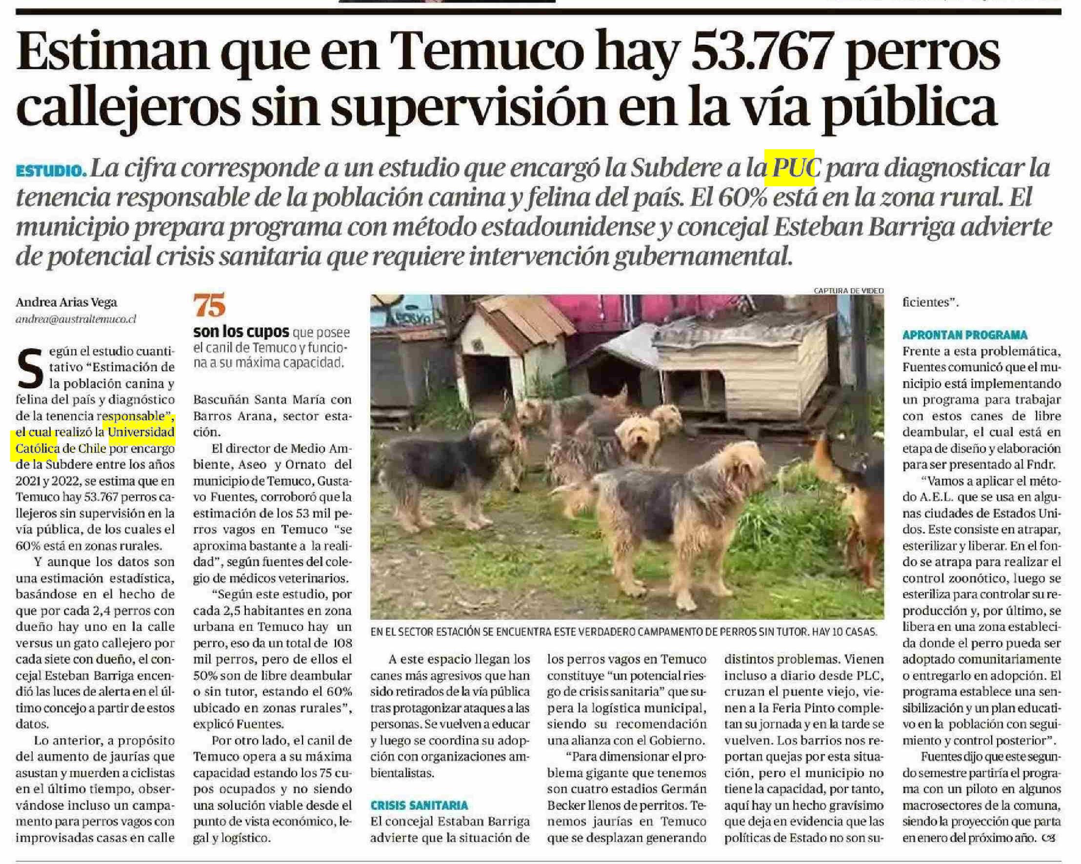 Título: Estiman que en Temuco hay 53.767 perros callejeros sin supervisión en la vía pública