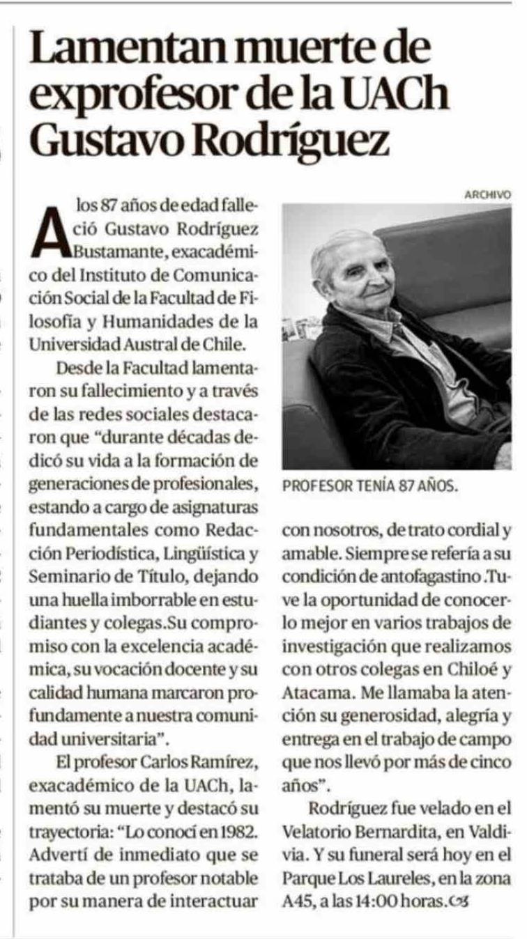 Lamentan muerte de exprofesor de la UACh Gustavo Rodríguez 03-03-2026 Diario Austral Región de Los Ríos |