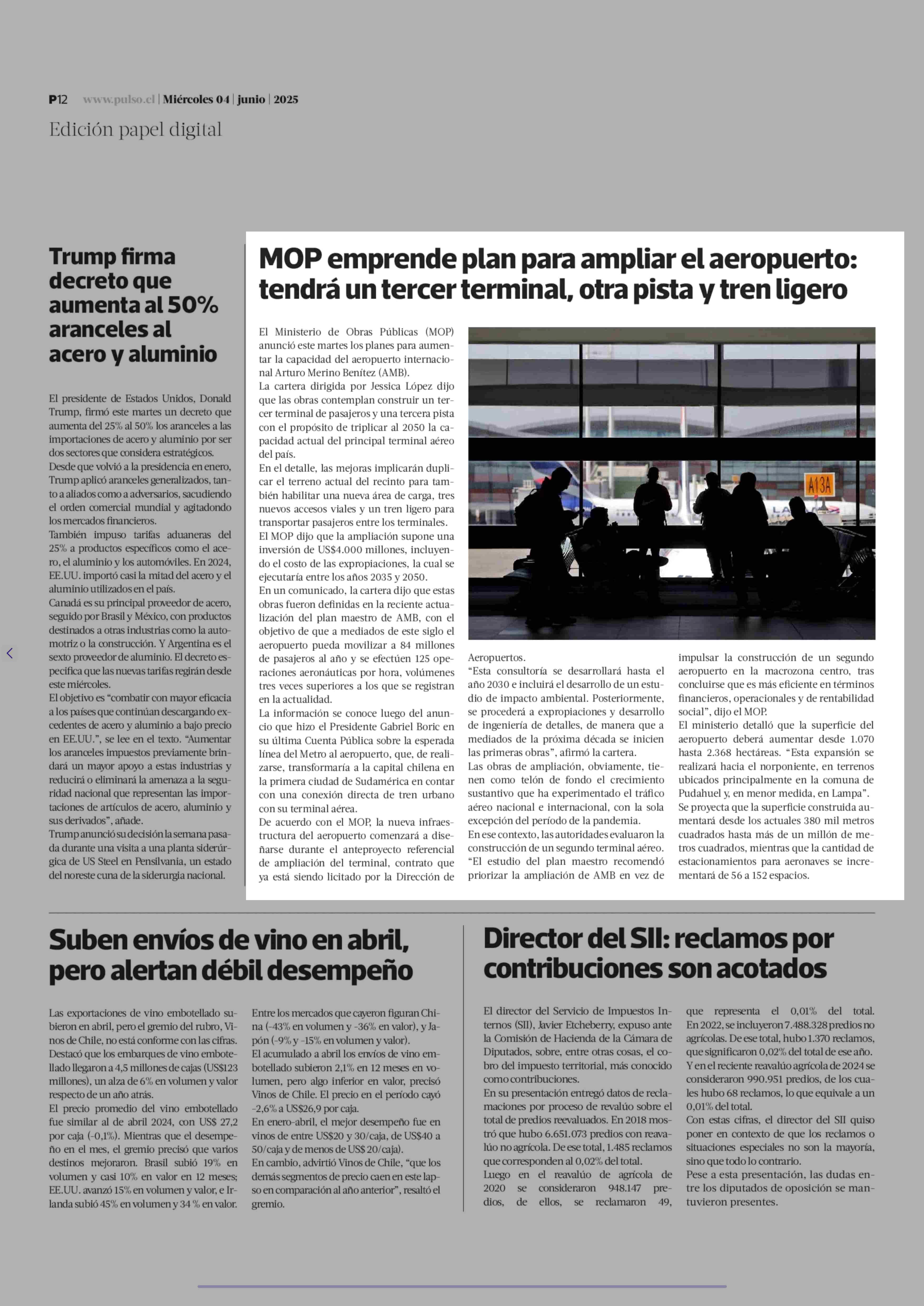 MOP emprende plan para ampliar el aeropuerto: tendrá un tercer terminal, otra pista y tren ligero 04-06-2025 La Tercera |
