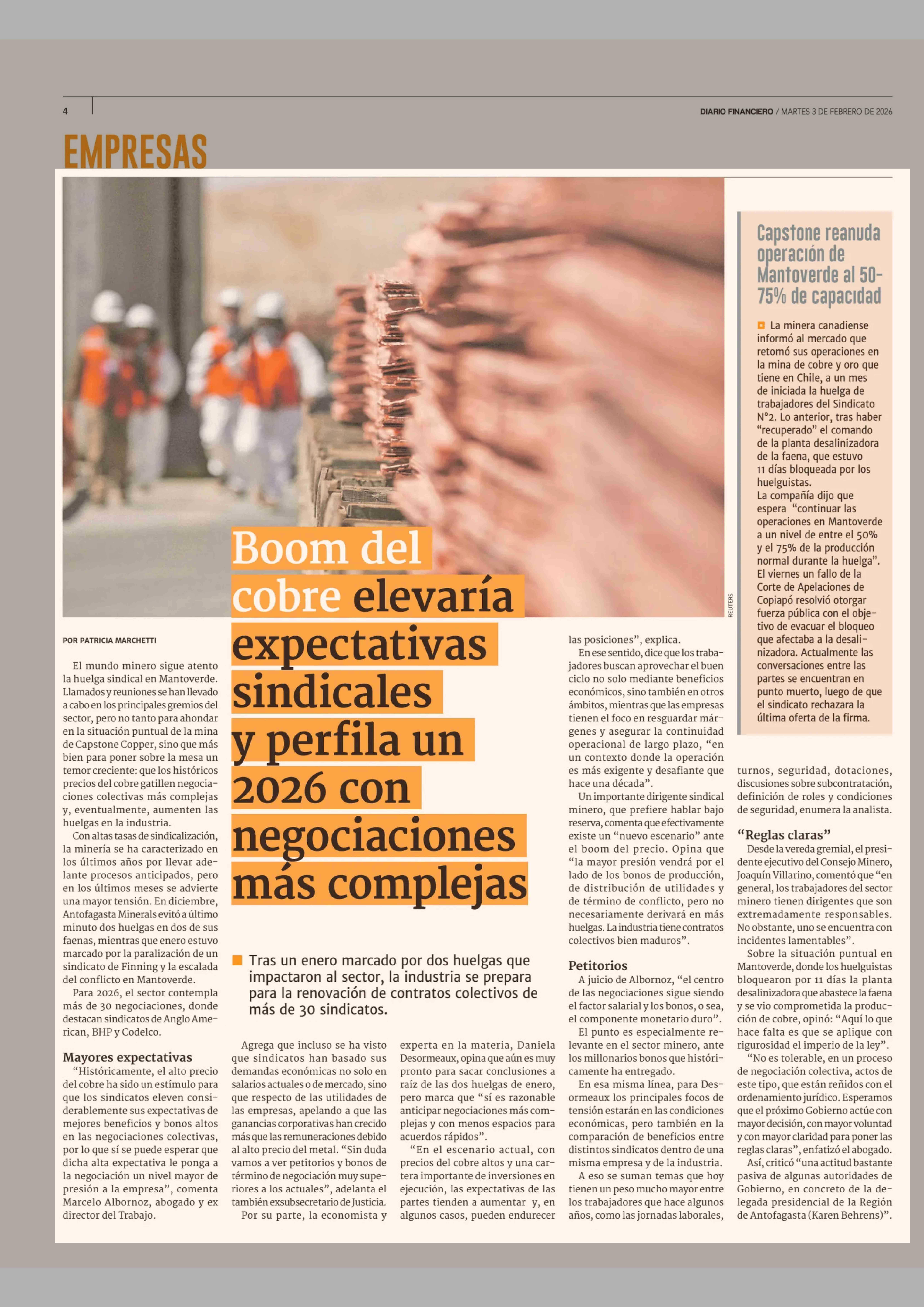 Boom del cobre elevaría expectativas sindicales y perfila un 2026 con negociaciones más complejas 03-02-2026 Diario Financiero |
