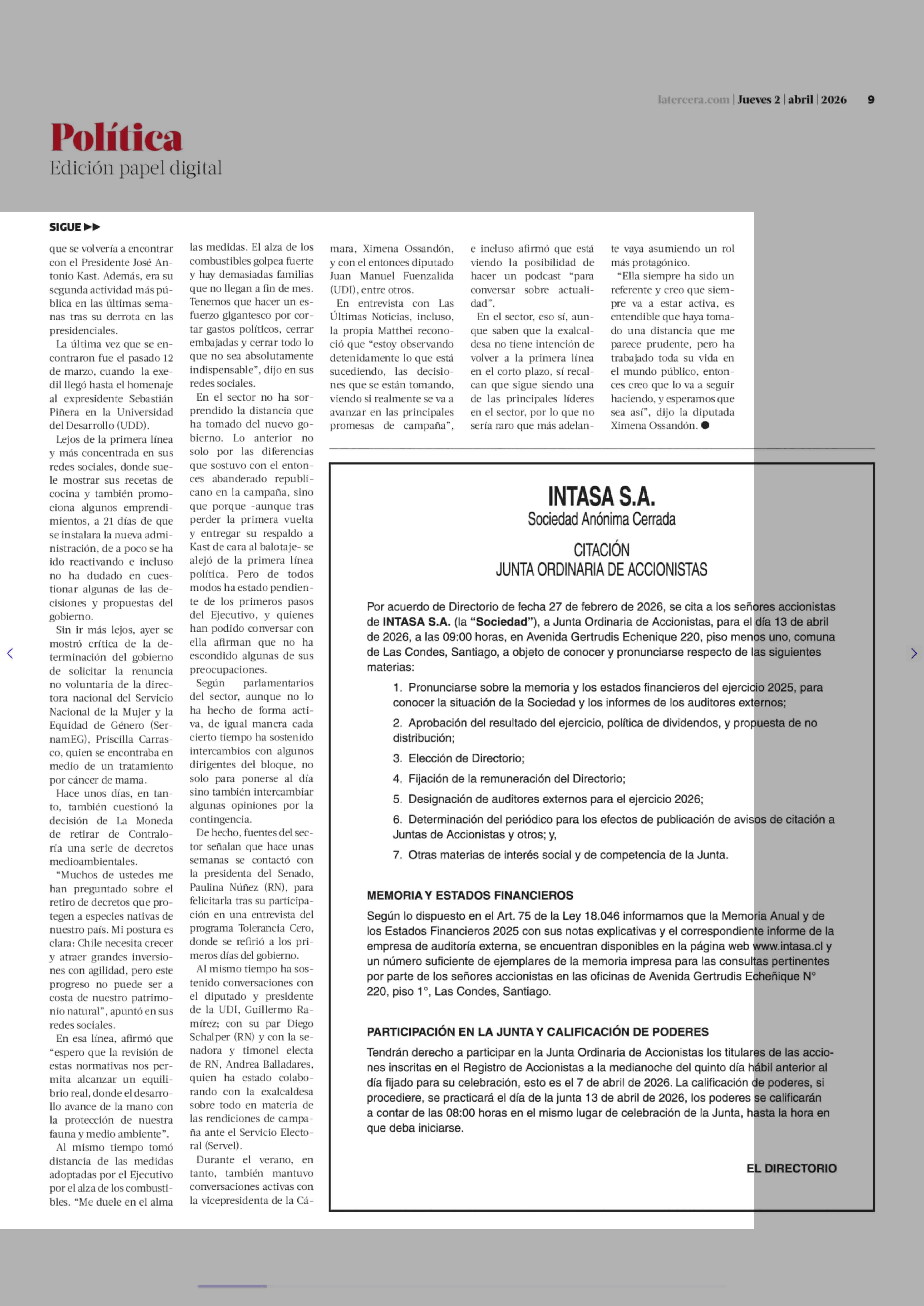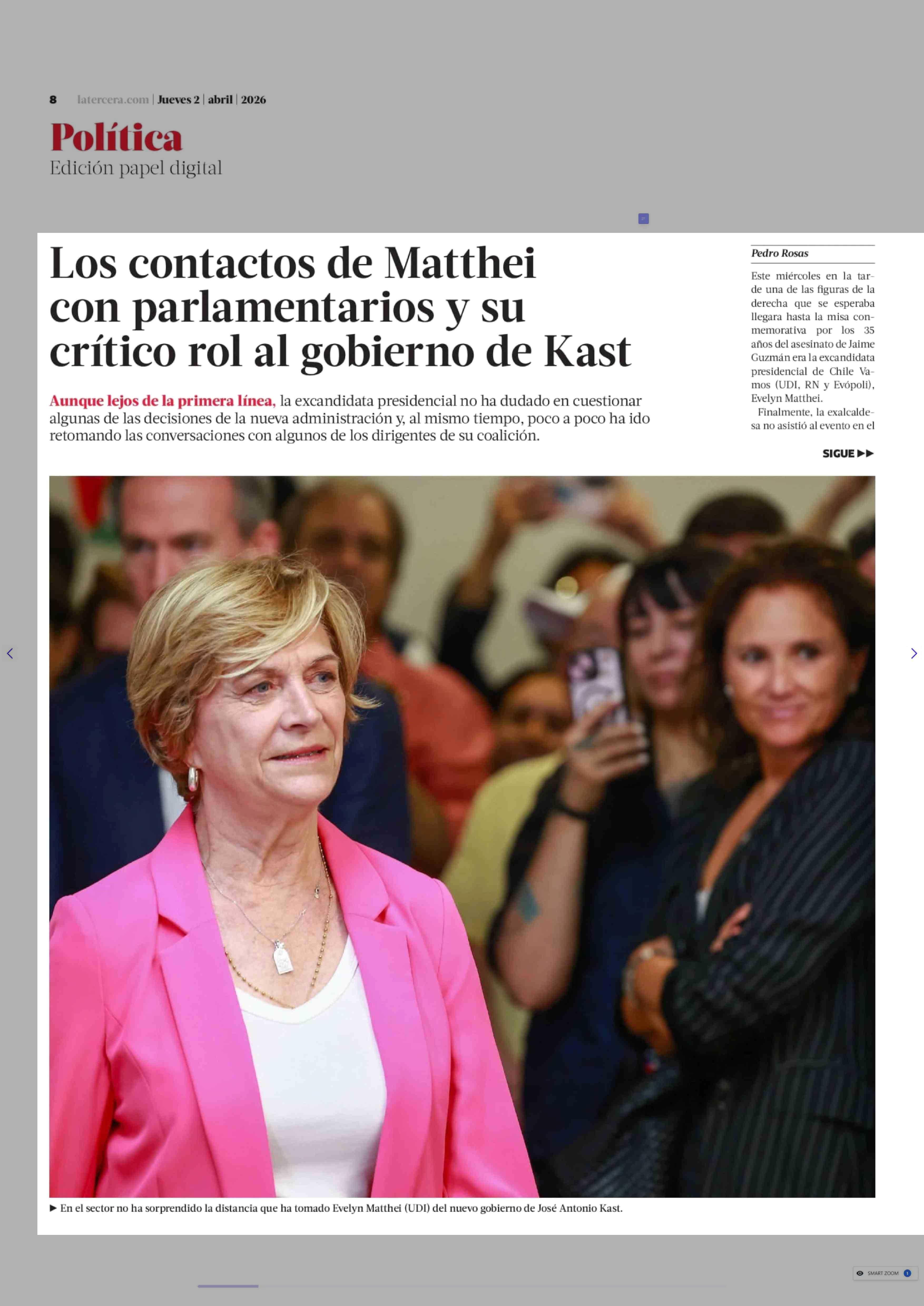 Los contactos de Matthei con parlamentarios y su crítico rol al gobierno de Kast 02-04-2026 La Tercera |