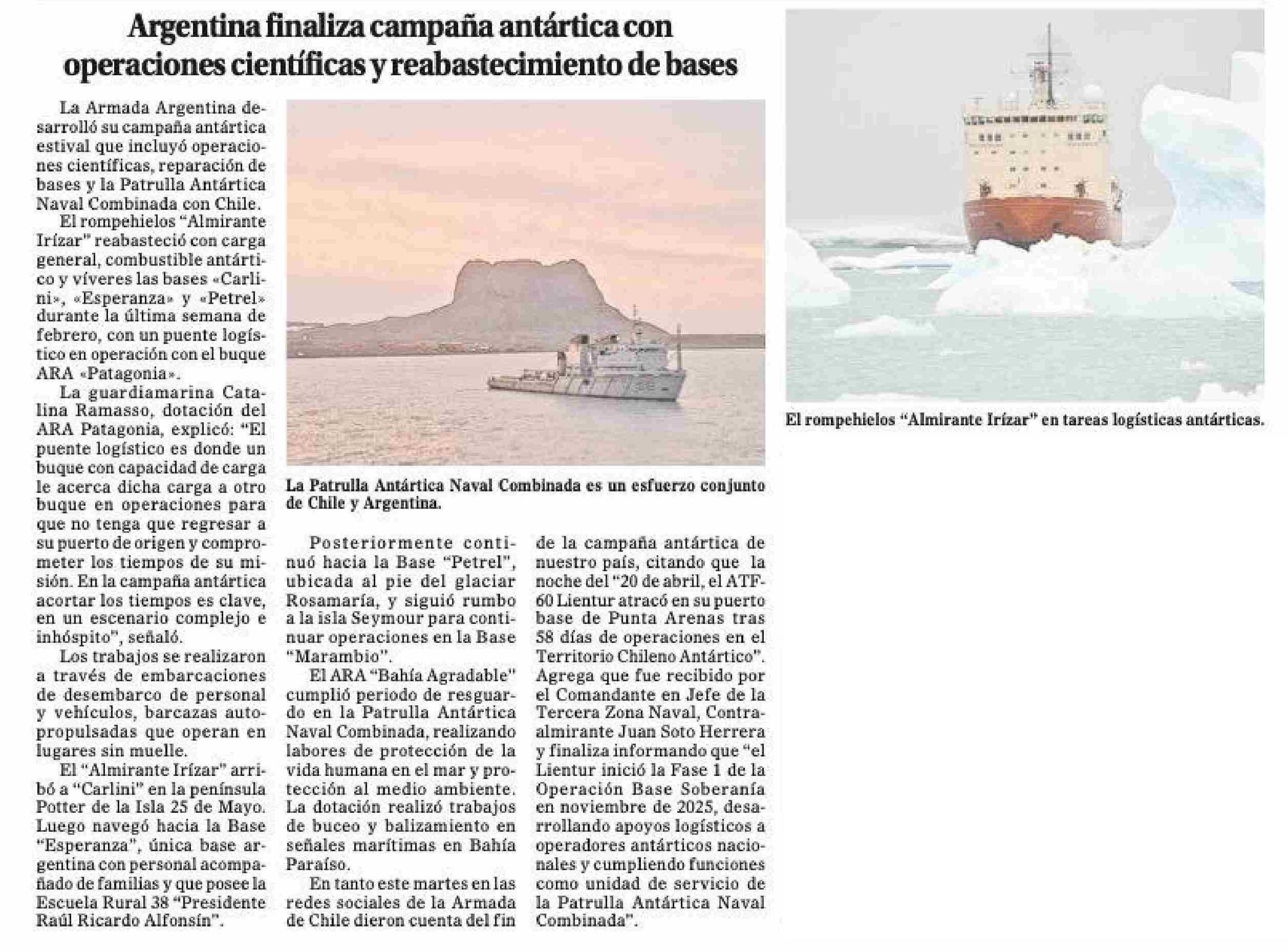Aipntina finaliza campaña antártica con operaciones científicas y reabastedmiento de bases 26-04-2026 El Magallanes |