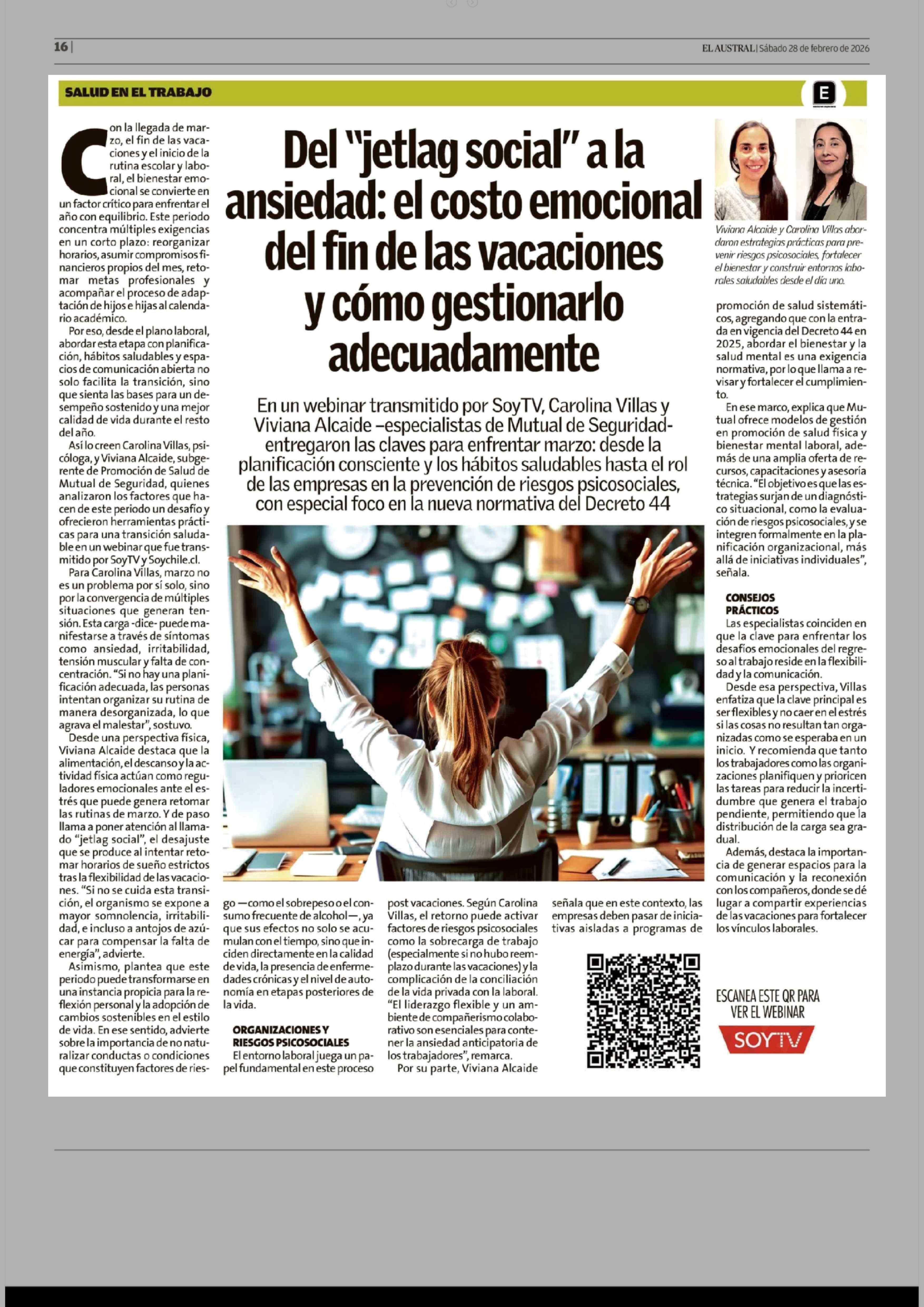 Del "jetlag social" a la ansiedad: el costo emocional del fin de las vacaciones y cómo gestionarlo adecuadamente 28-02-2026 El Austral de la Araucanía |