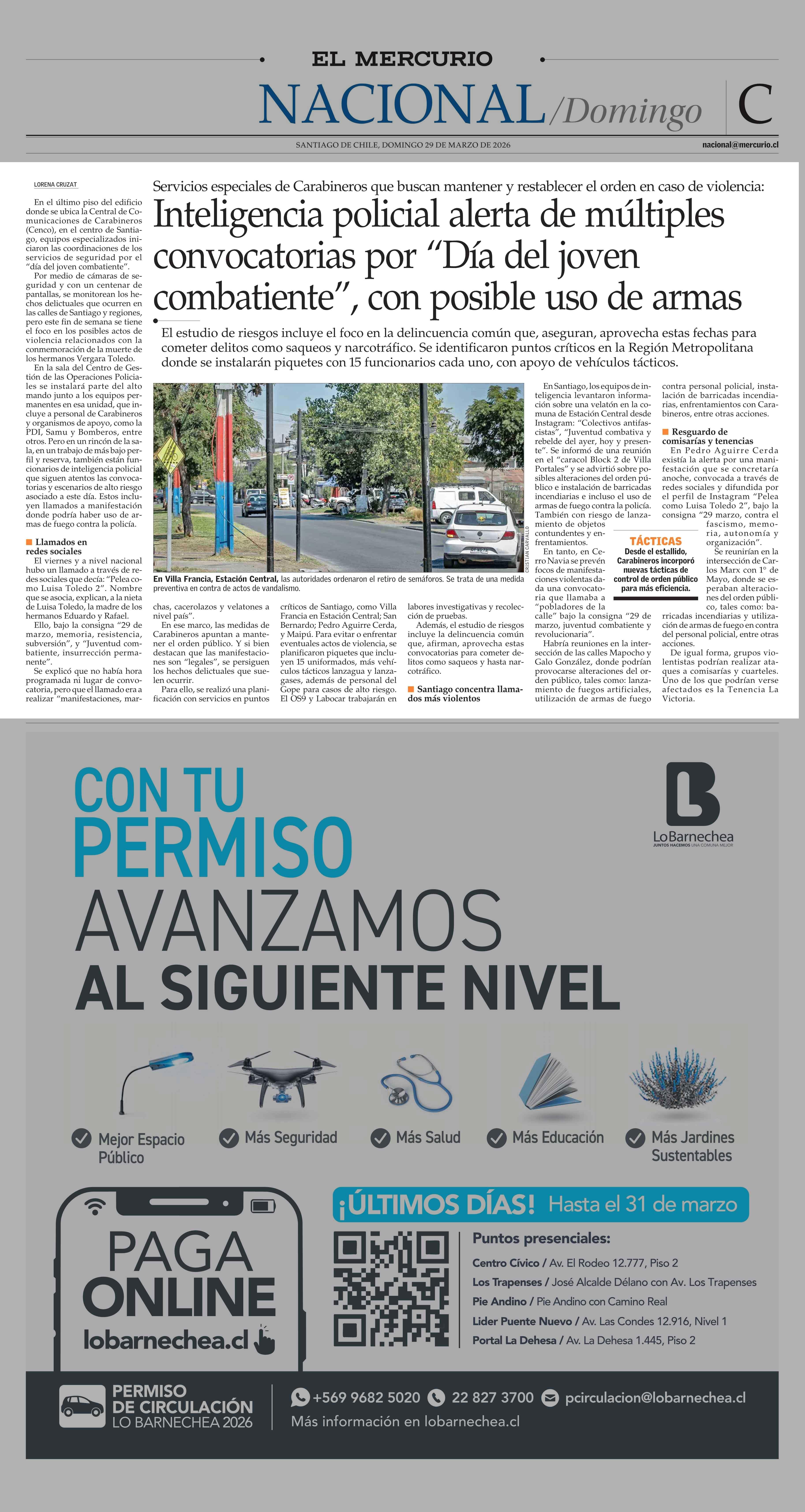 Inteligencia policial alerta de múltiples convocatorias por “Día del joven combatiente”, con posible uso de armas 29-03-2026 El Mercurio |