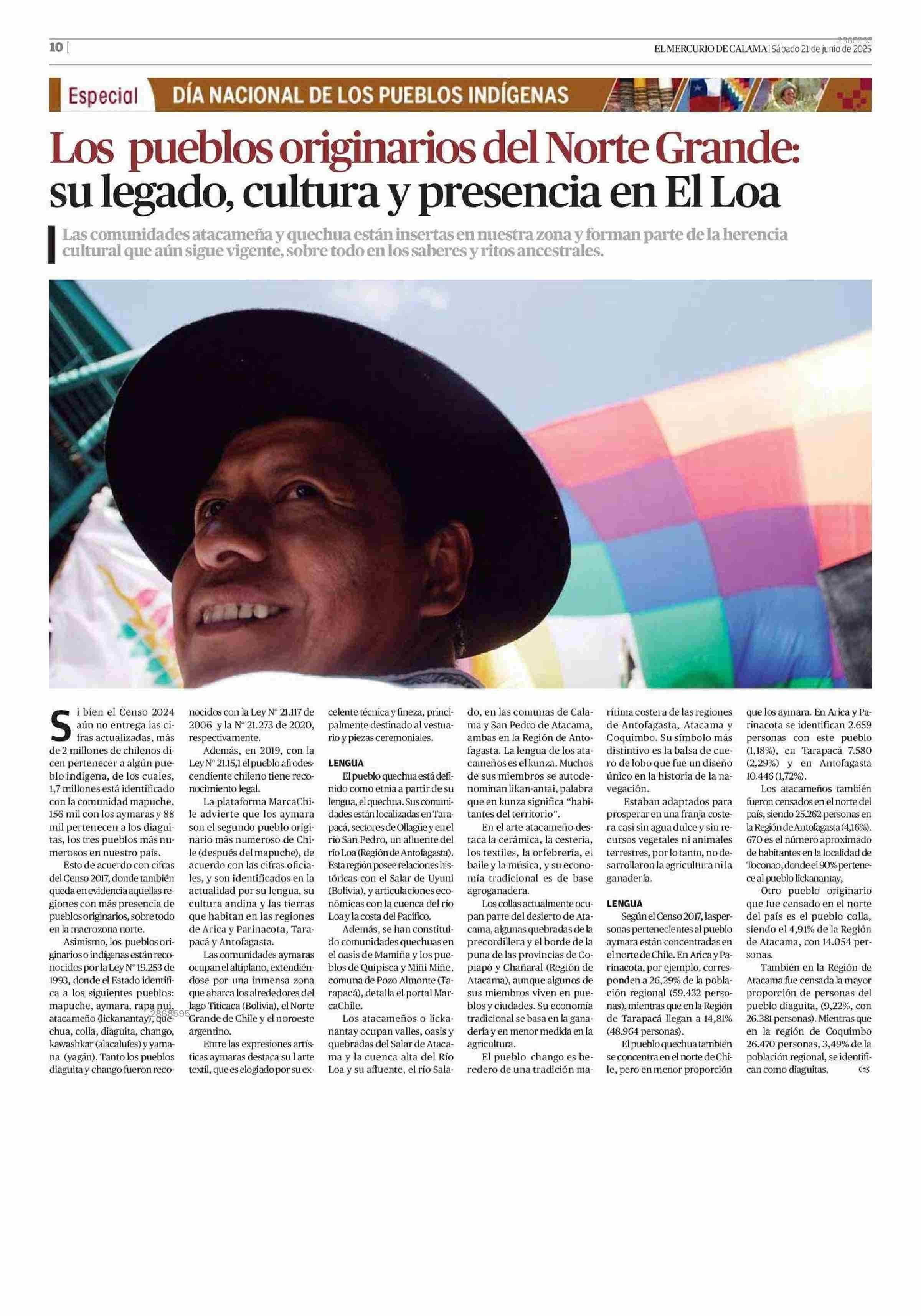 Los pueblos originarios del Norte Grande: su legado, cultura y presencia en El Loa 21-06-2025 El Mercurio de Calama |