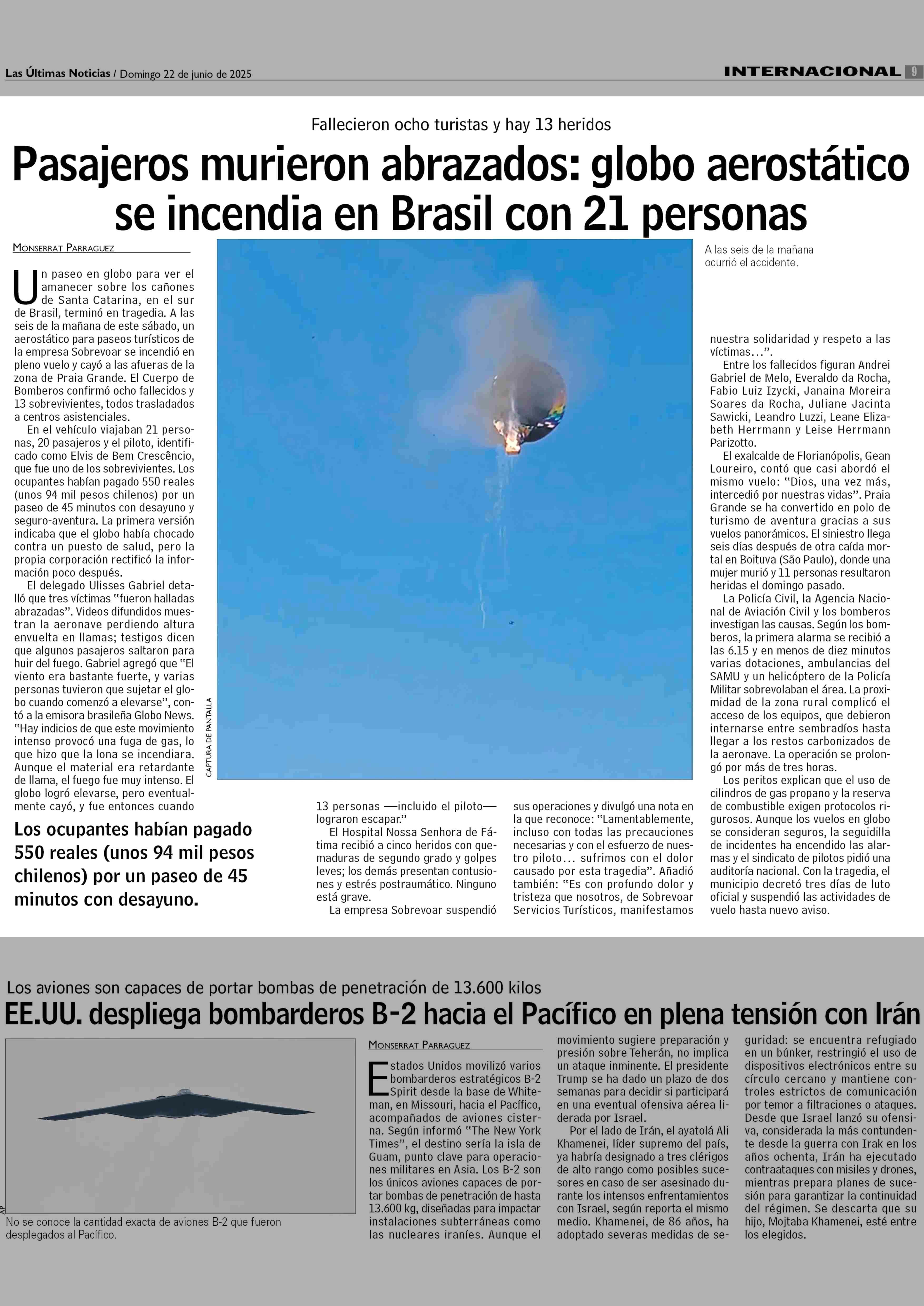 Pasajeros murieron abrazados: globo aerostático se incendia en Brasil con 21 personas 22-06-2025 Las Últimas Noticias |