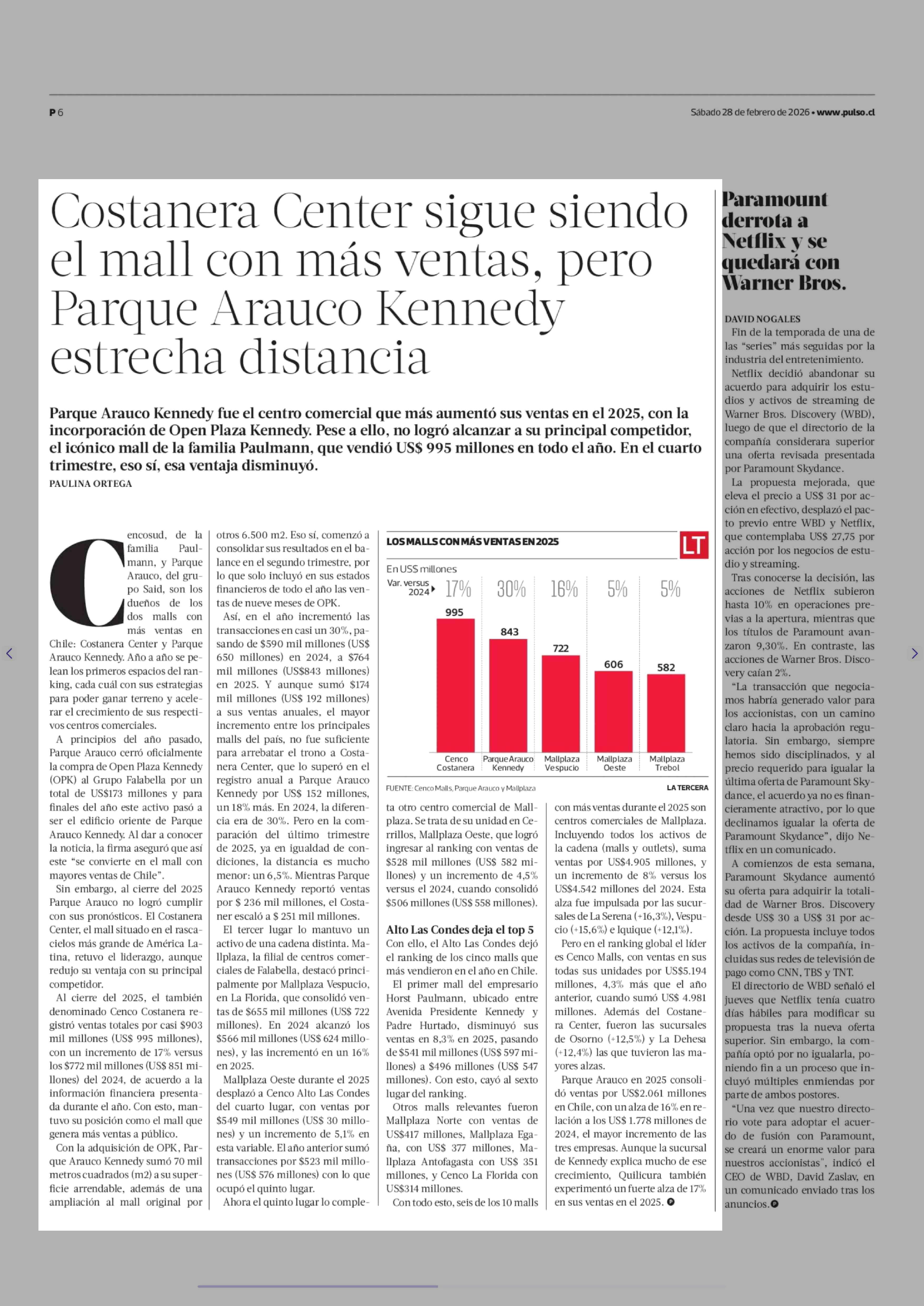 Costanera Center sigue siendo el mall con más ventas, pero Parque Arauco Kennedy estrecha distancia 28-02-2026 La Tercera |