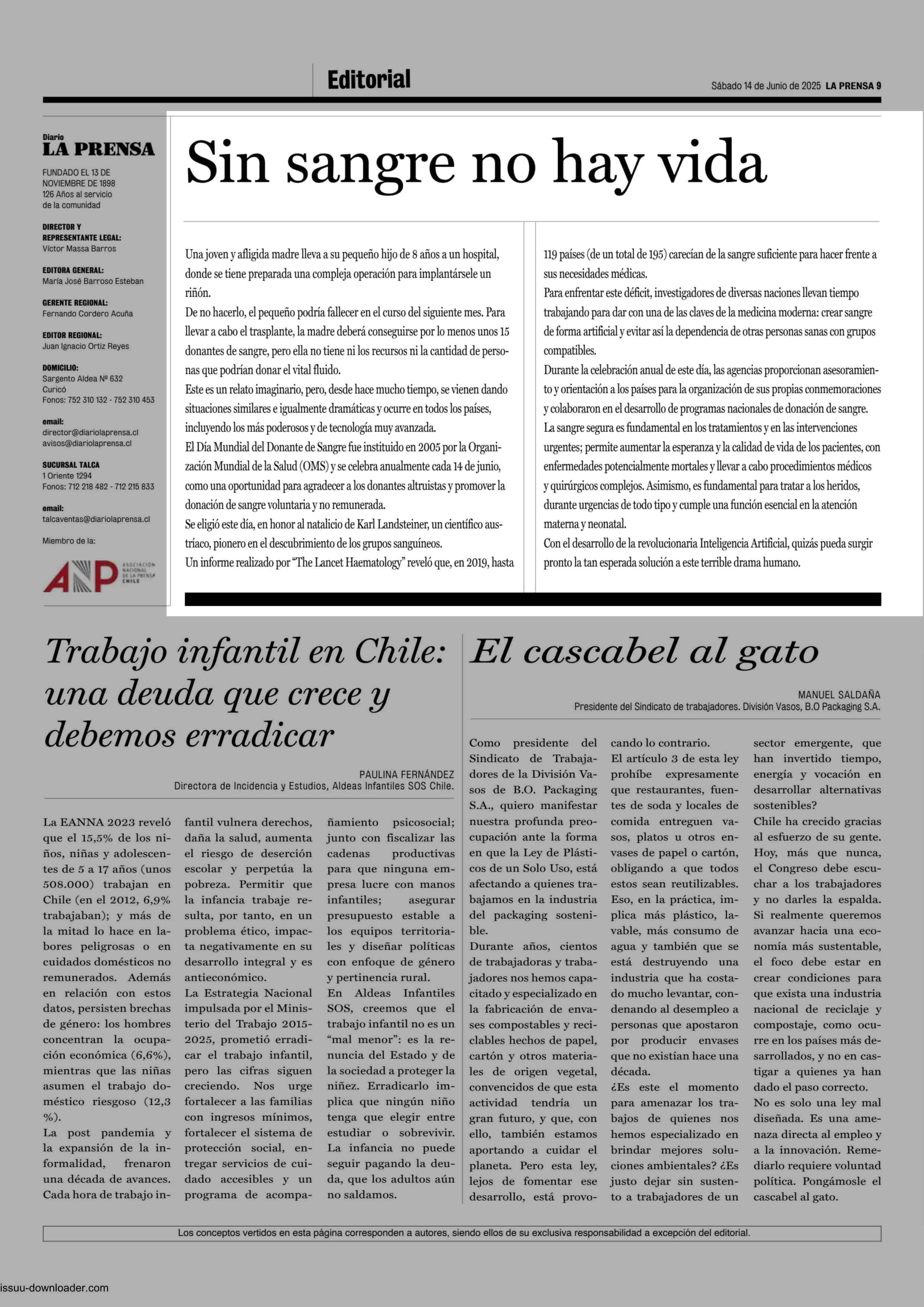 EDITORIAL: Sin sangre no hay vida 14-06-2025 La Prensa de Curicó |