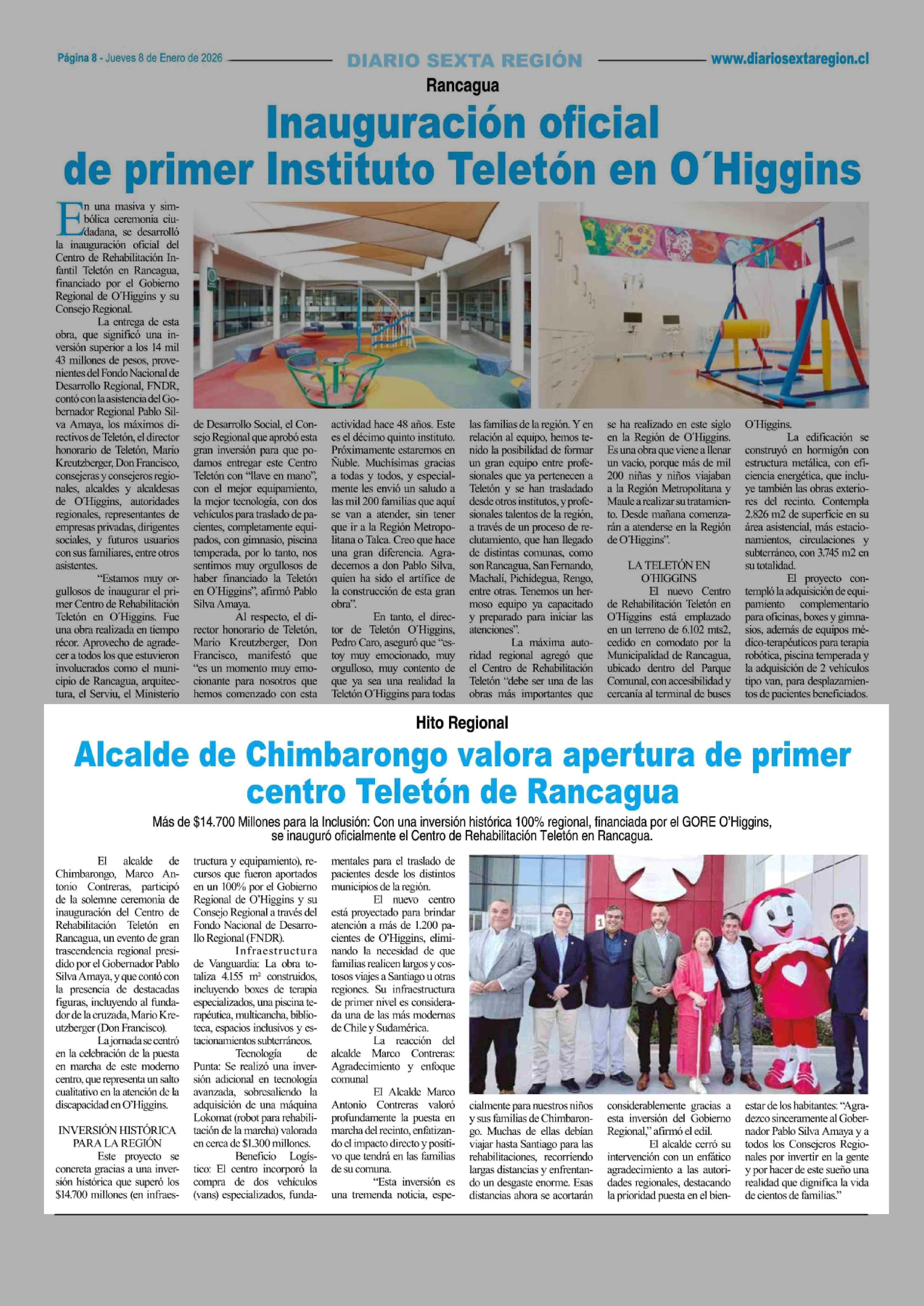 Alcalde de Chimbarongo valora apertura de primer centro Teletón de Rancagua 08-01-2026 Diario VI Región |