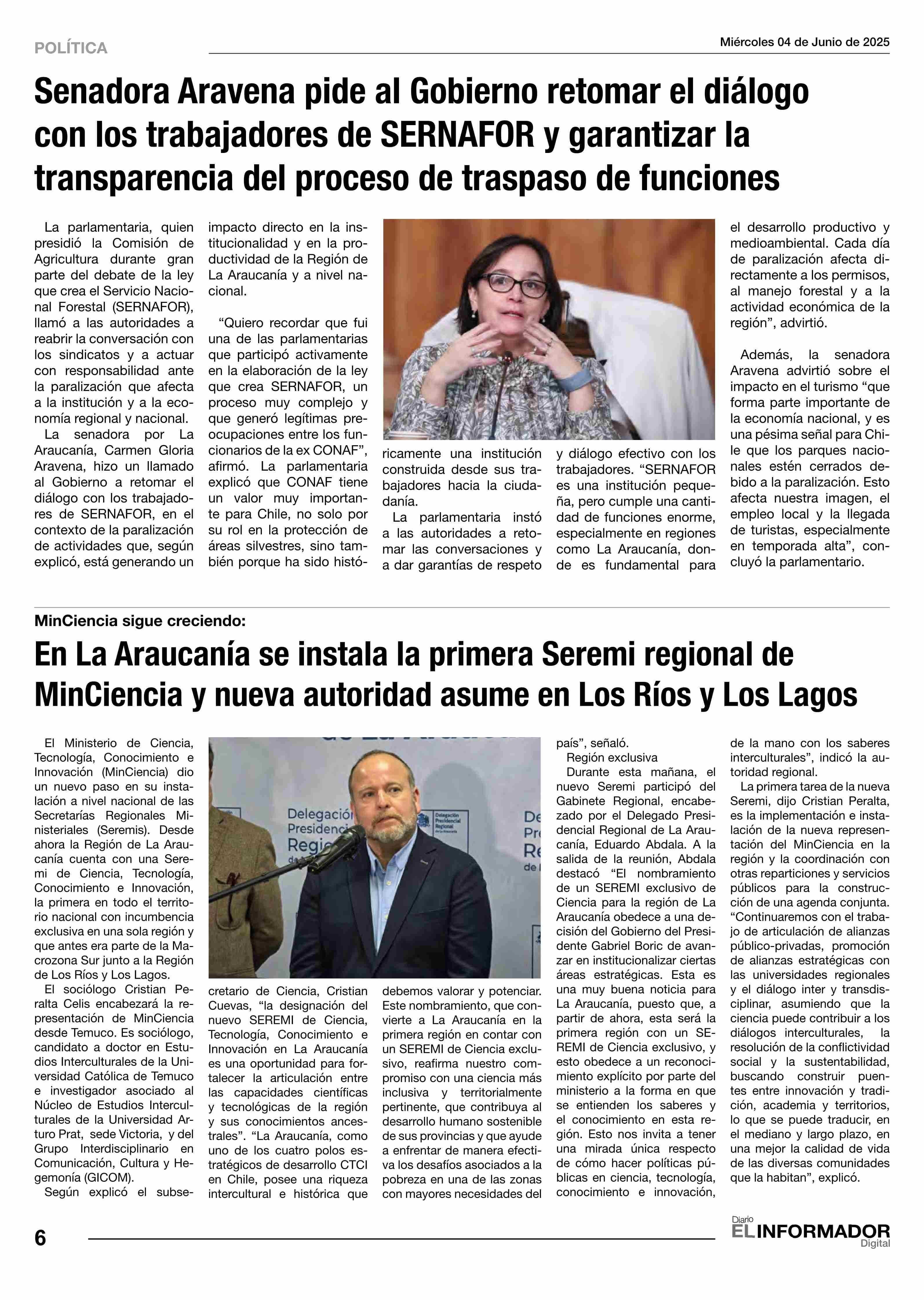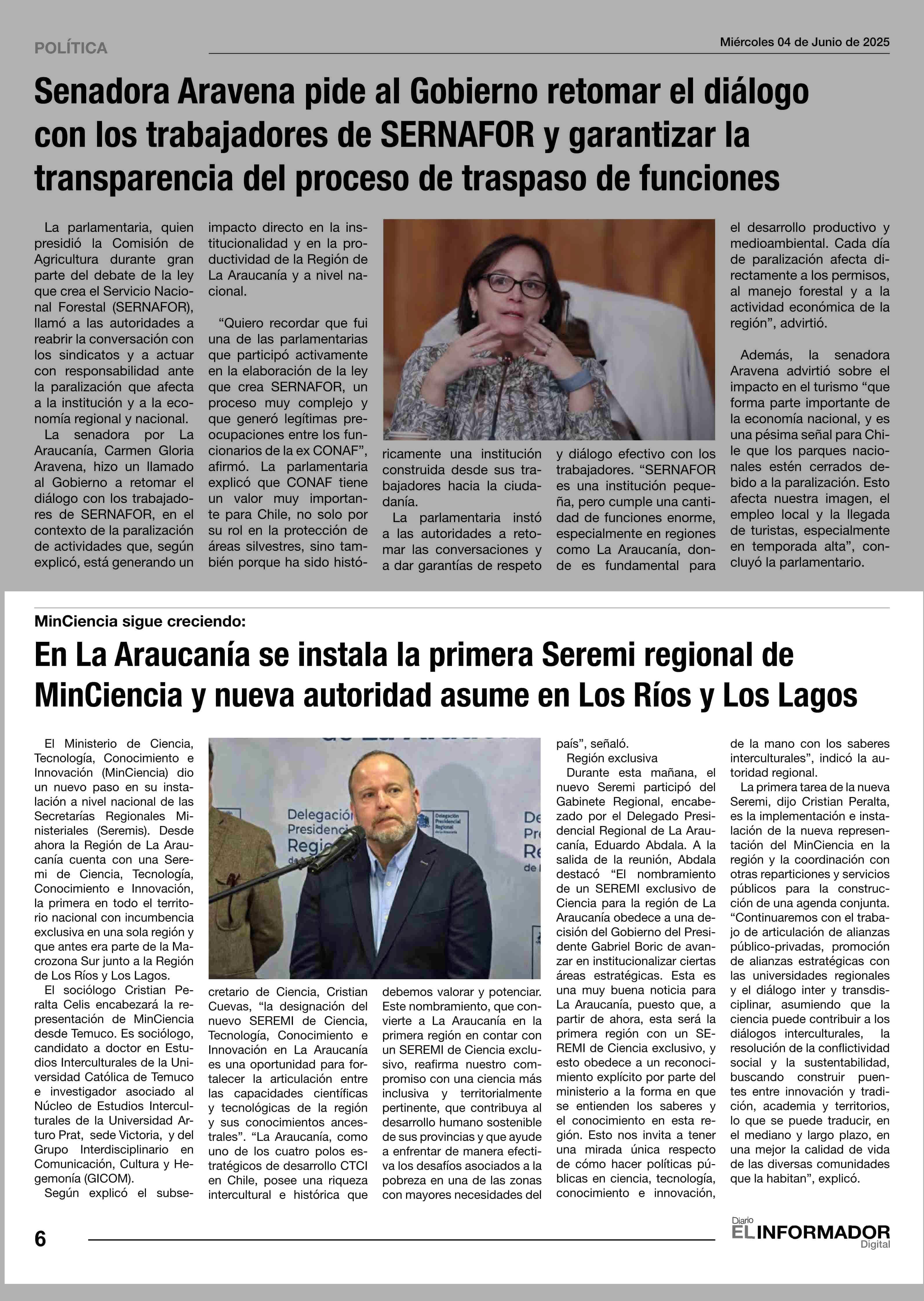 En La Araucanía se instala la primera Seremi regional de MinCiencia y nueva autoridad asume en Los Ríos y Los Lagos 04-06-2025 El Informador |
