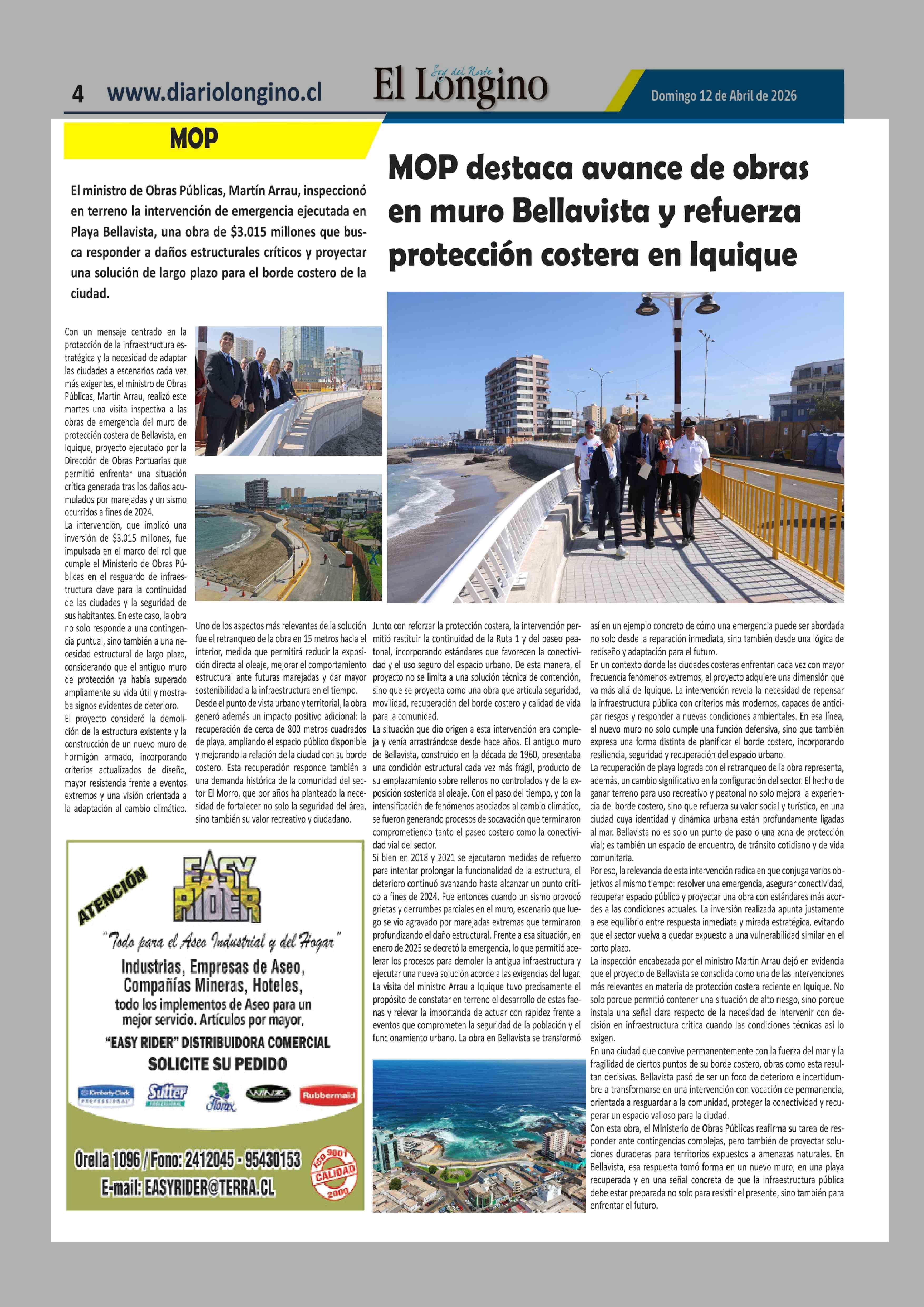 MOP destaca avance de obras en muro Bellavista y refuerza protección costera en Iquique 12-04-2026 El Longino |