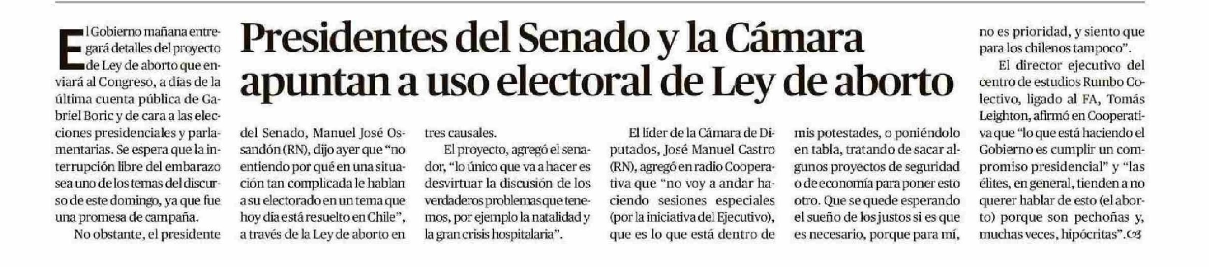 Presidentes del Senado y la Cámara apuntan a uso electoral de Ley de aborto 27-05-2025 El Austral de Osorno |