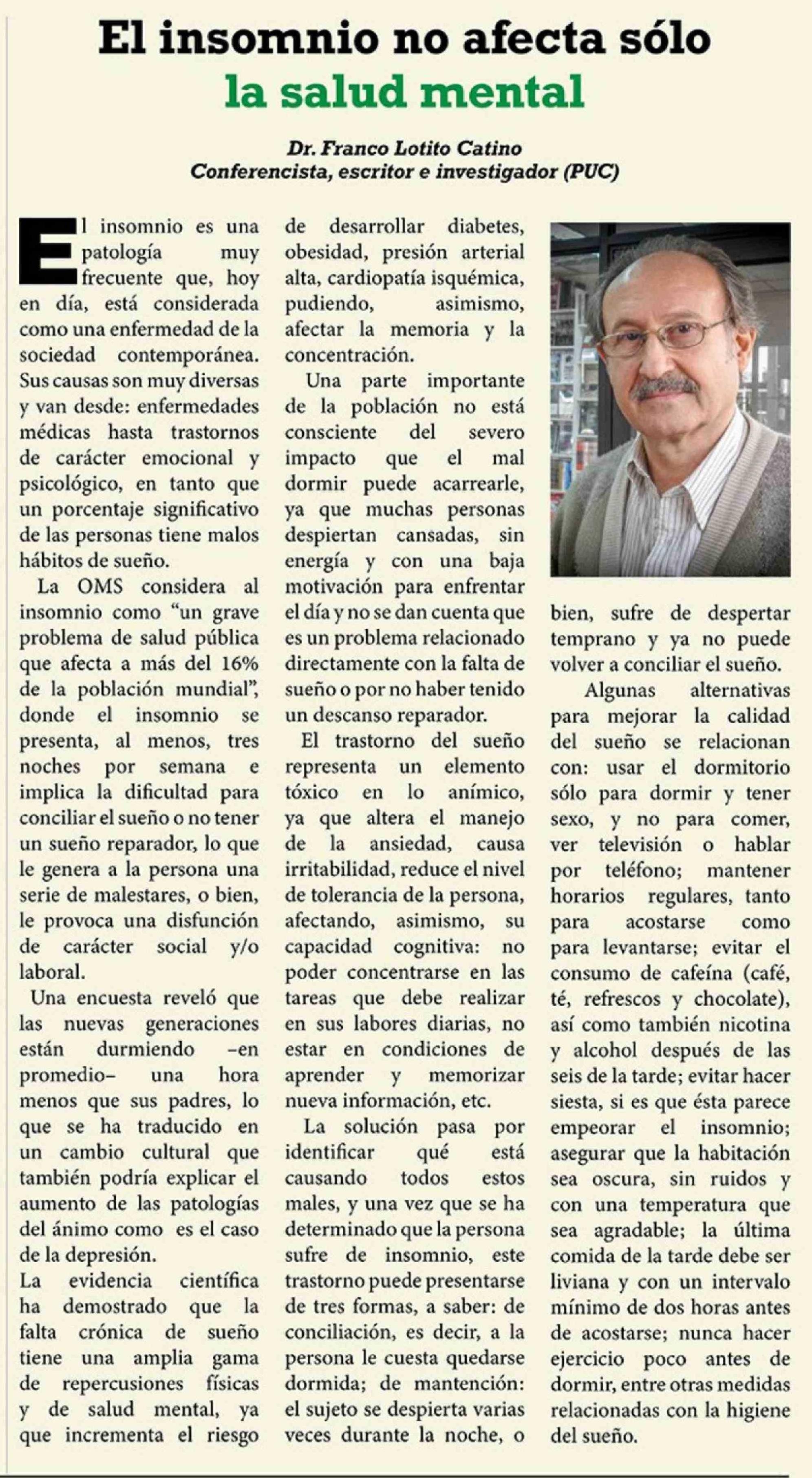 | Título: | Columnas de Opinión: El insomnio no afecta sólo la salud mental |