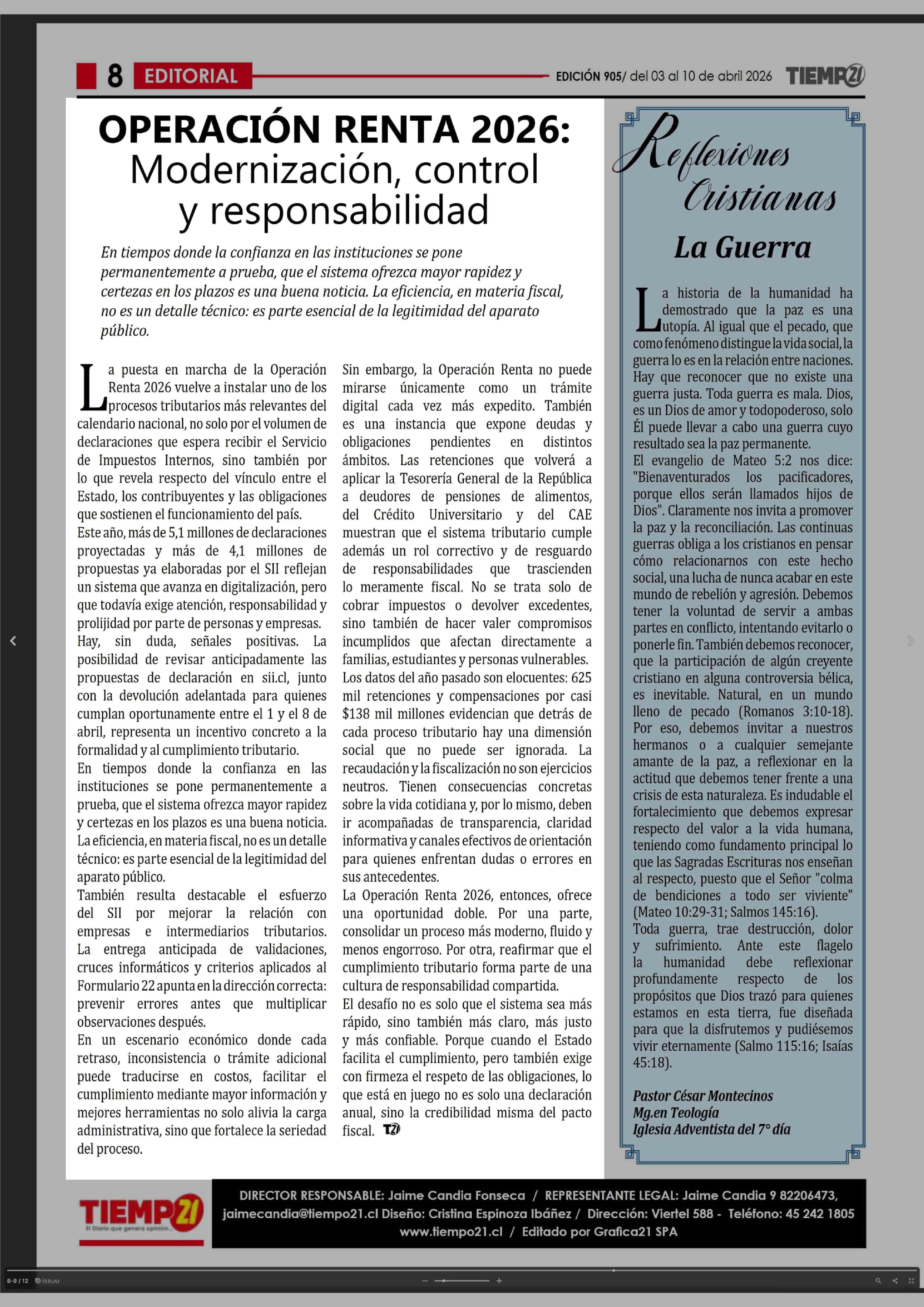 Editorial: OPERACIÓN RENTA 2026: Modernización, control y responsabilidad 04-04-2026 Tiempo 21 |