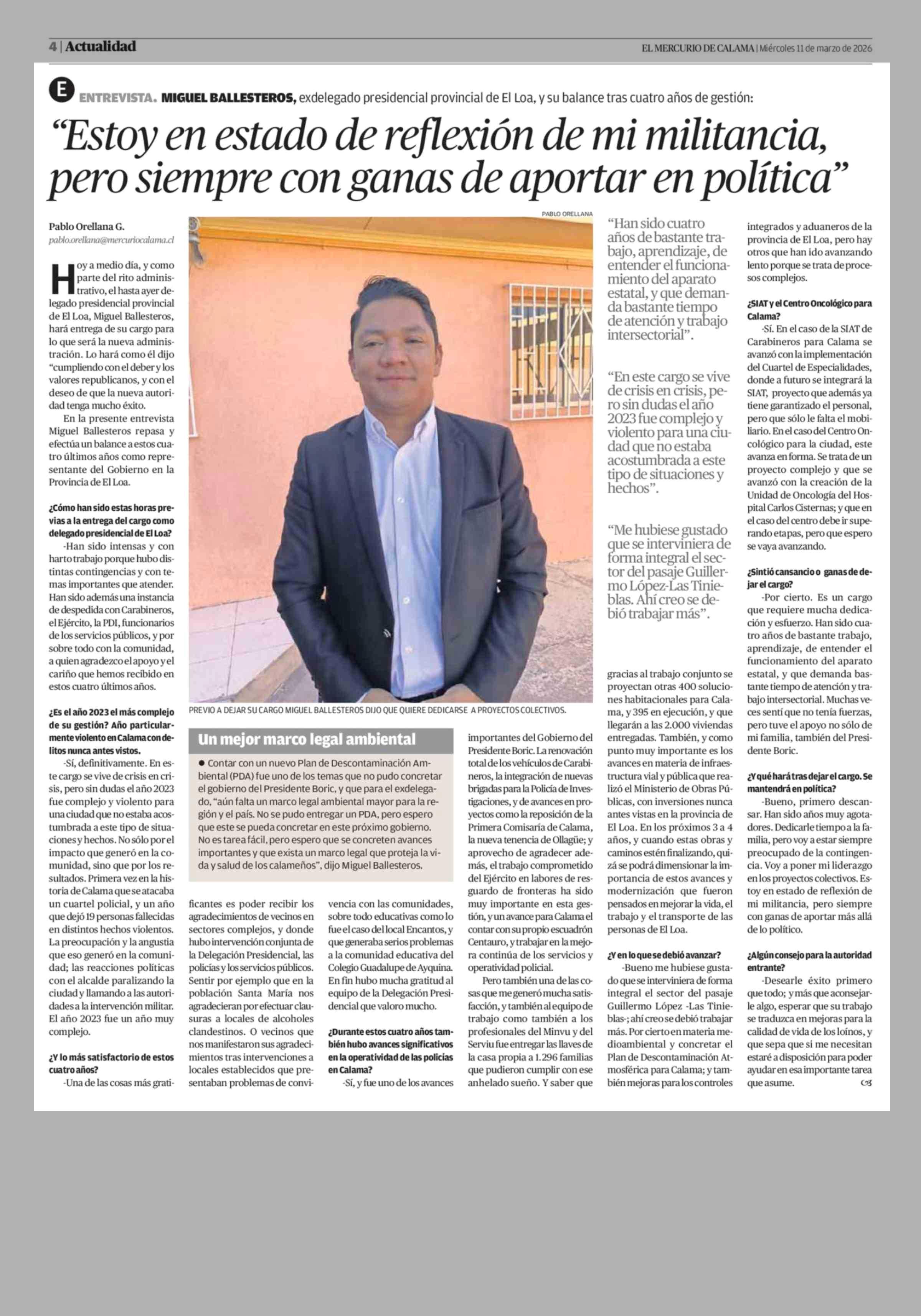 "Estoy en estado de reflexión de mi militancia, pero siempre con ganas de aportar en política" 11-03-2026 El Mercurio de Calama |