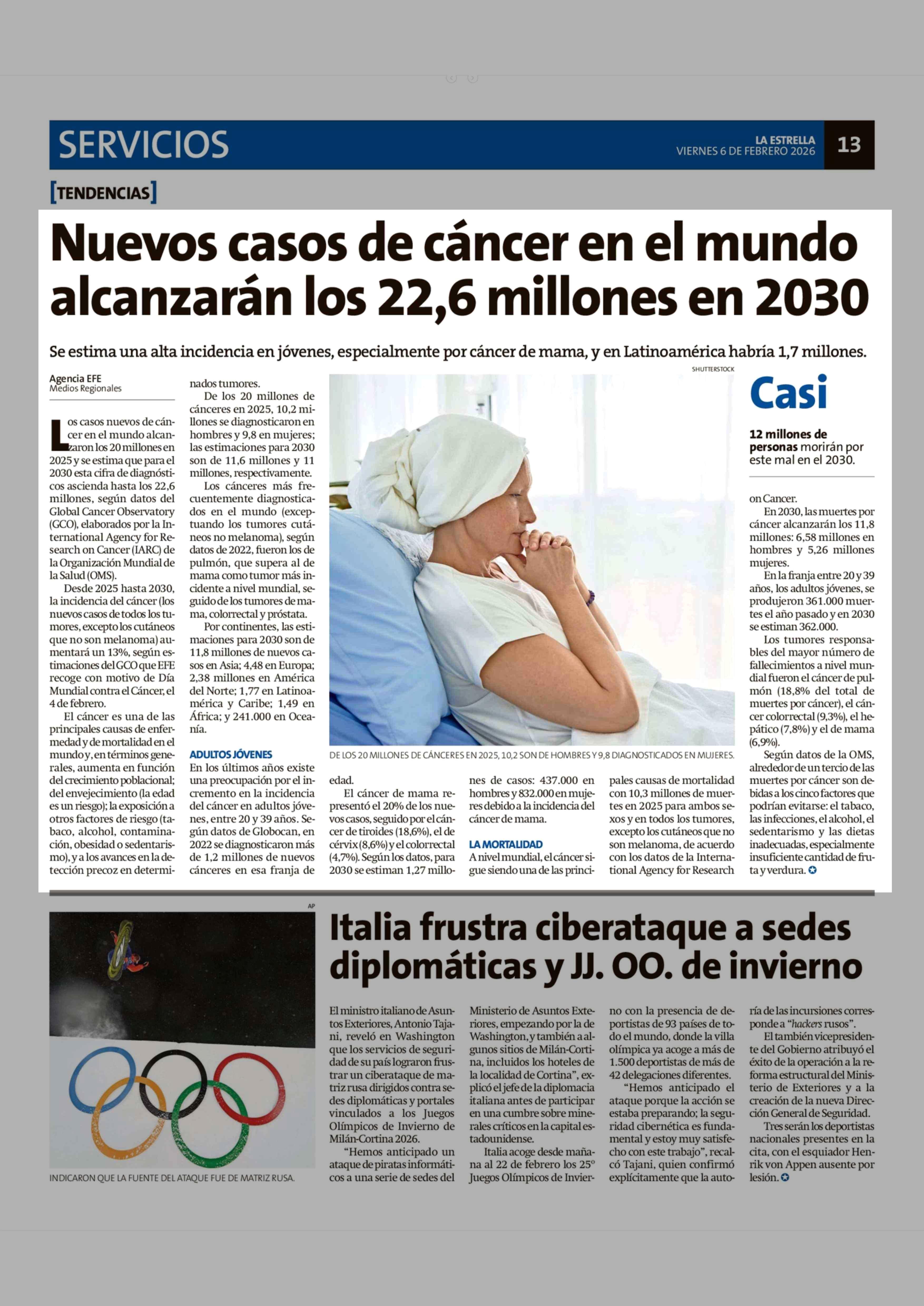 Nuevos casos de cáncer en el mundo alcanzarán los 22,6 millones en 2030 06-02-2026 La Estrella de Chiloé |