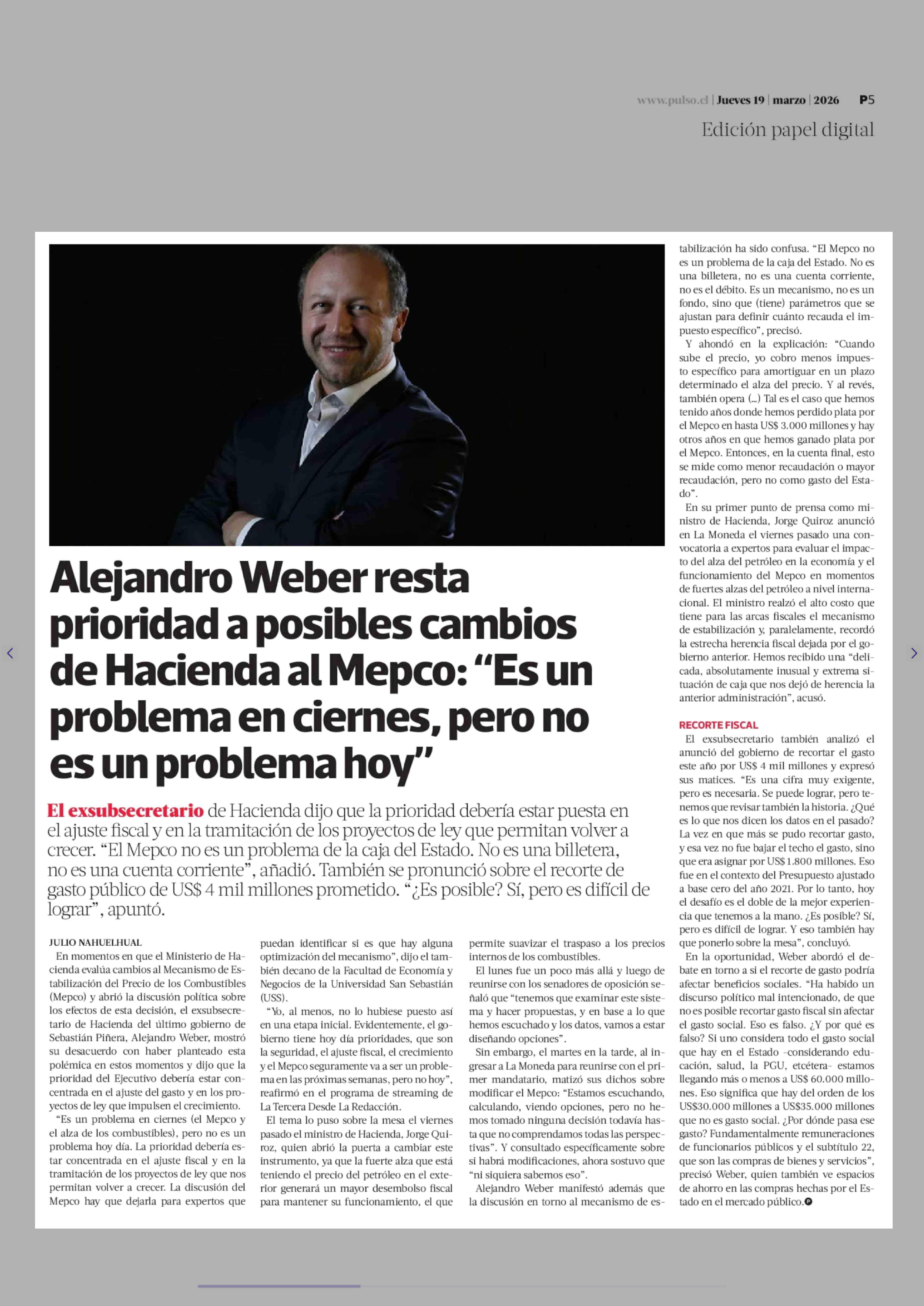 Alejandro Weber resta prioridad a posibles cambios de Hacienda al Mepco: "Es un problema en ciernes, pero no es un problema hoy" 19-03-2026 La Tercera |