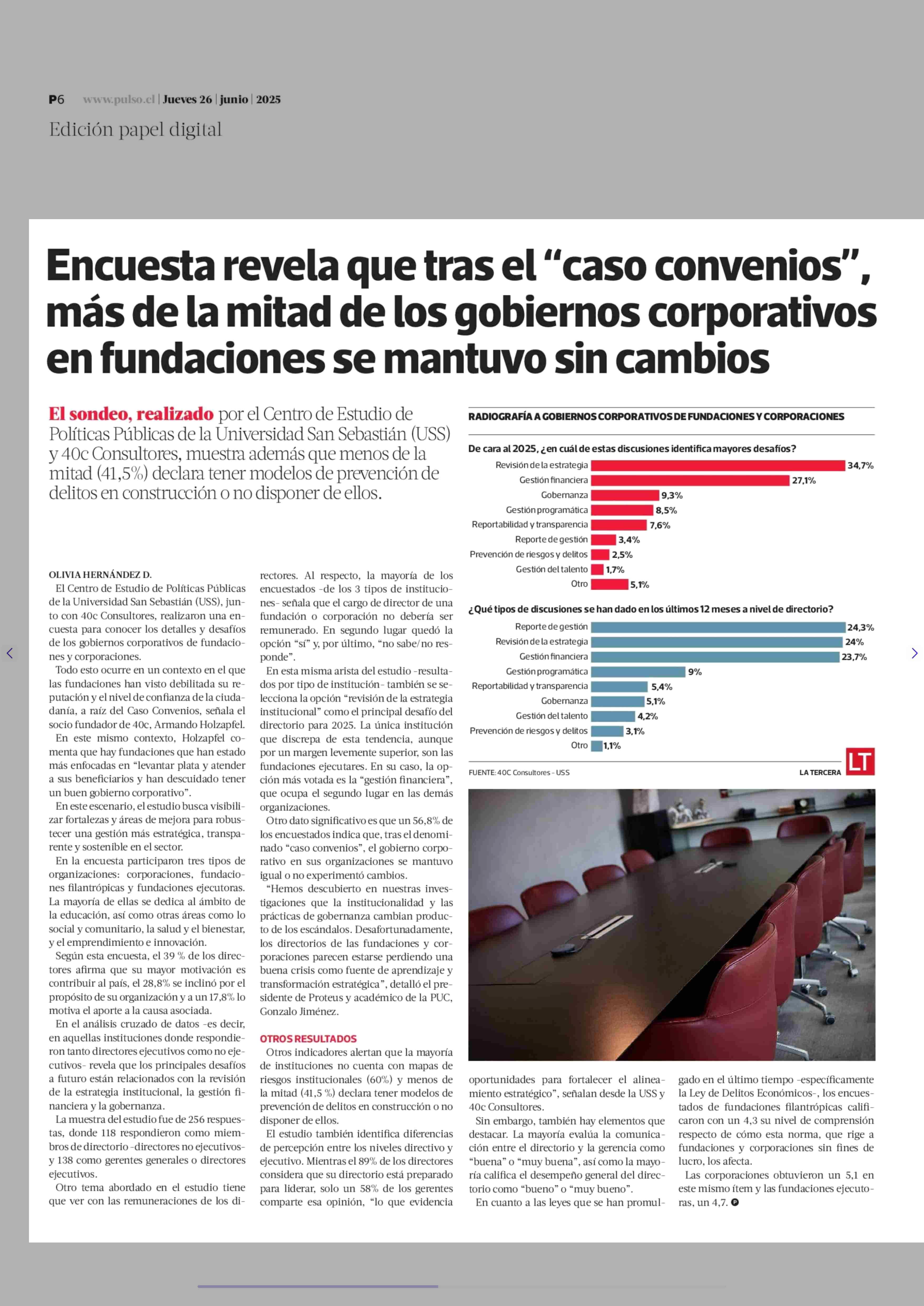Encuesta revela que tras el “caso convenios”, más de la mitad de los gobiernos corporativos en fundaciones se mantuvo sin cambios 26-06-2025 La Tercera |