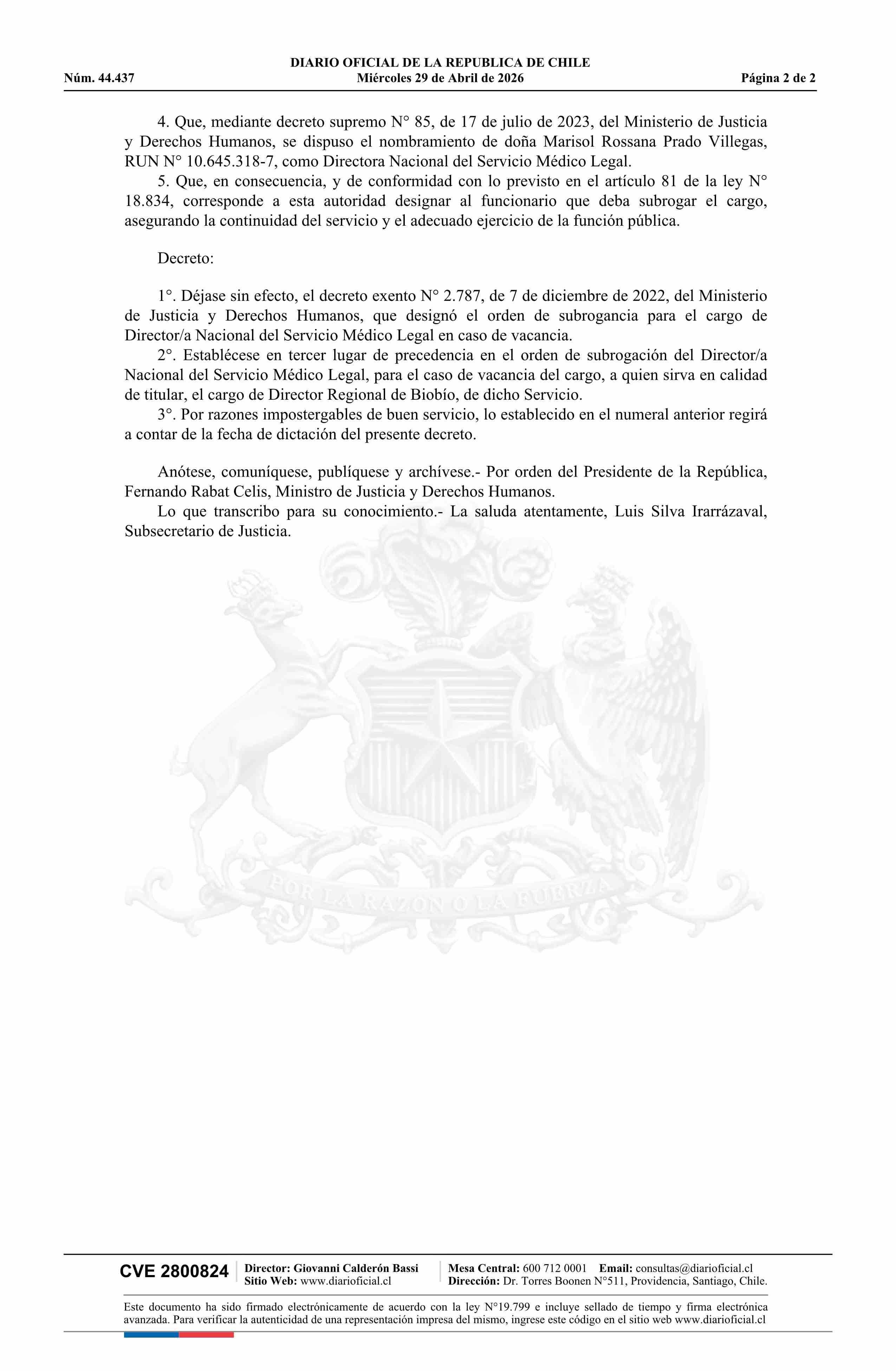 | Título: | Decreto exento número 1.147, de 2026.- Deja sin efecto decreto N° 2.787 exento, de 2022, y establece orden de subrogación para el cargo de Director/a Nacional del Servicio Médico Legal en caso de vacancia |