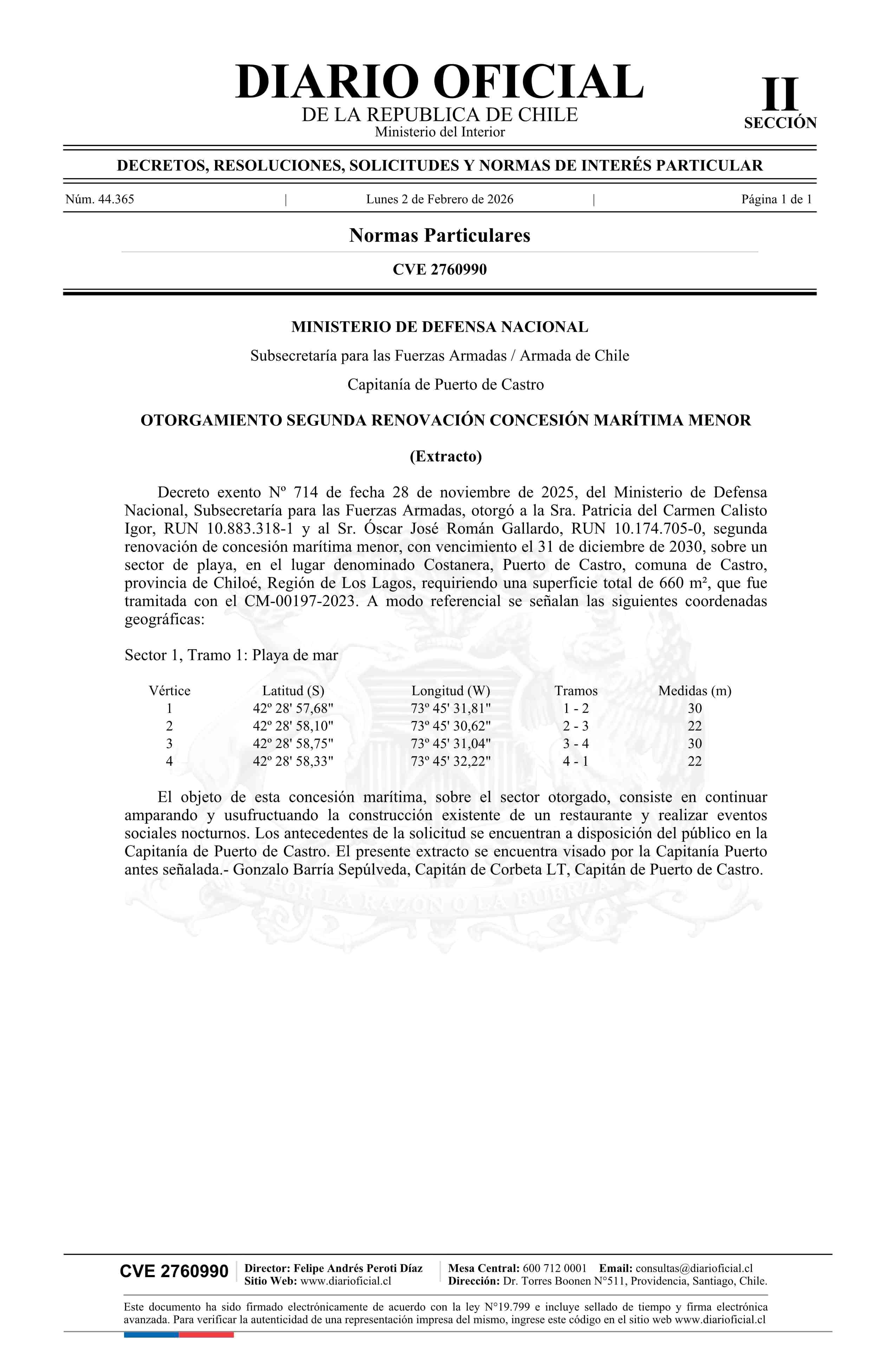| Título: | Extracto de decreto exento número 714, de 2025.- Otorgamiento segunda renovación concesión marítima menor |