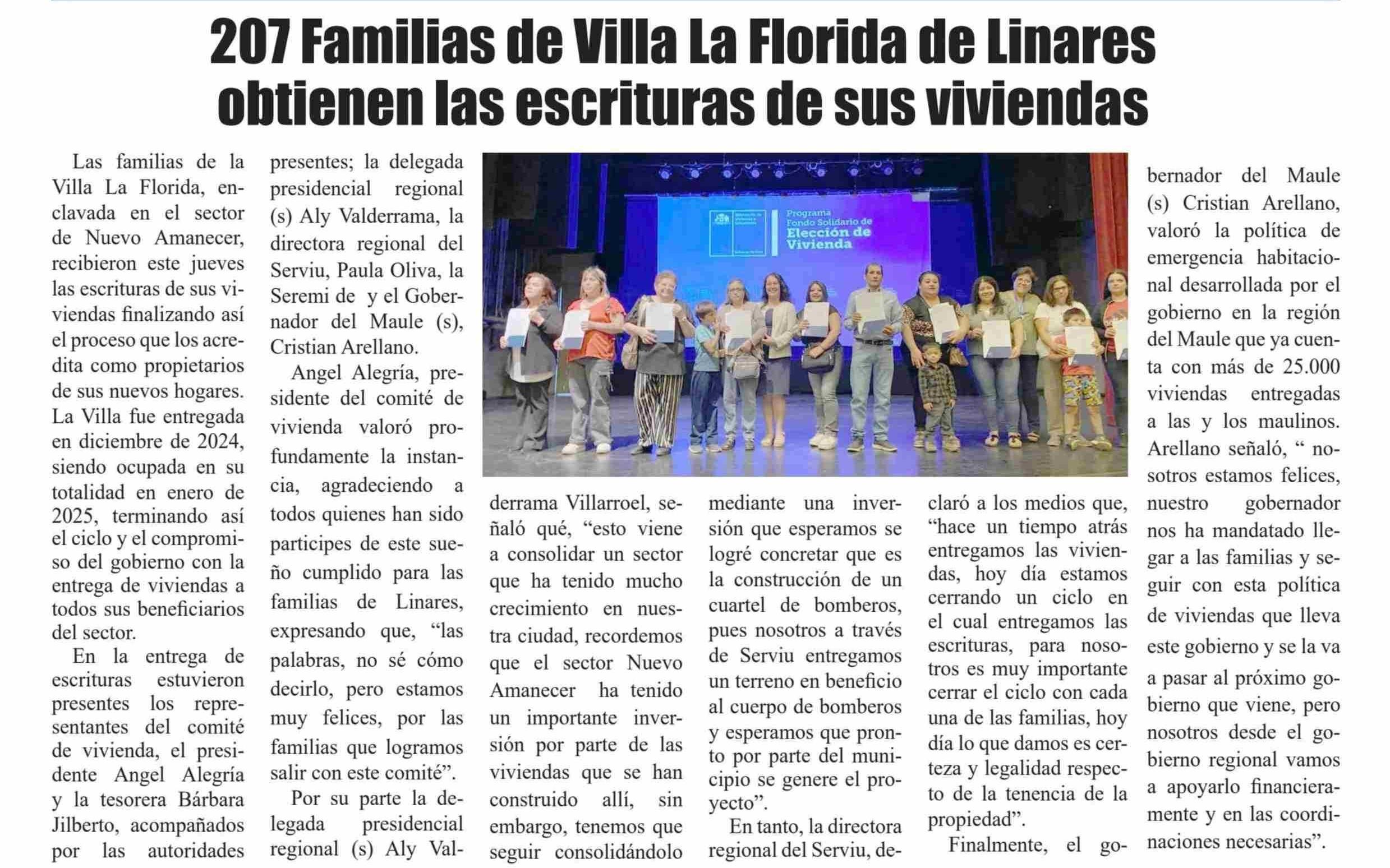 | Título: | 207 Familias de Villa La Florida de Linares obtienen las escrituras de sus viviendas |