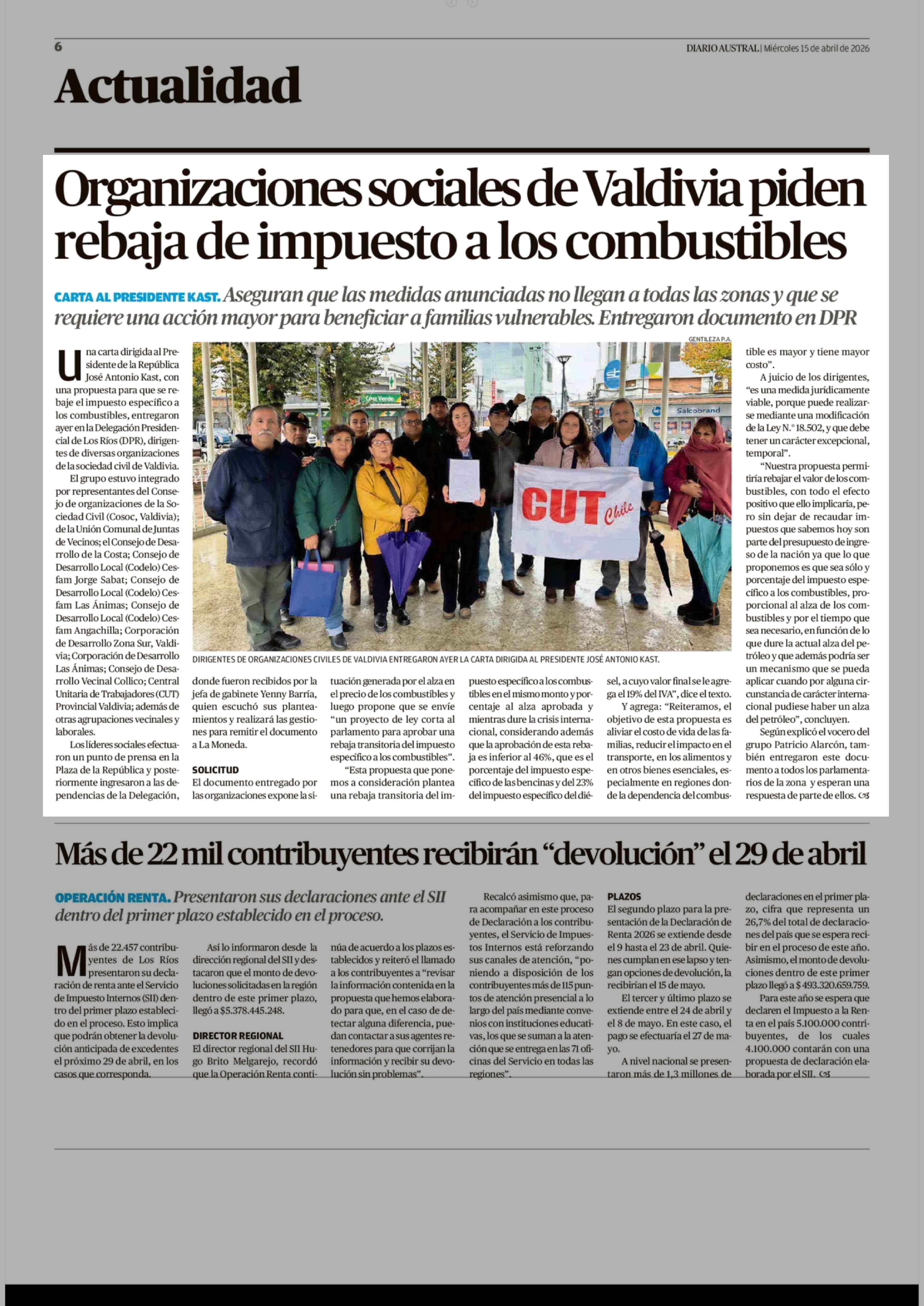 Organizaciones sociales de Valdivia piden rebaja de impuesto a los combustibles 15-04-2026 Diario Austral Región de Los Ríos |