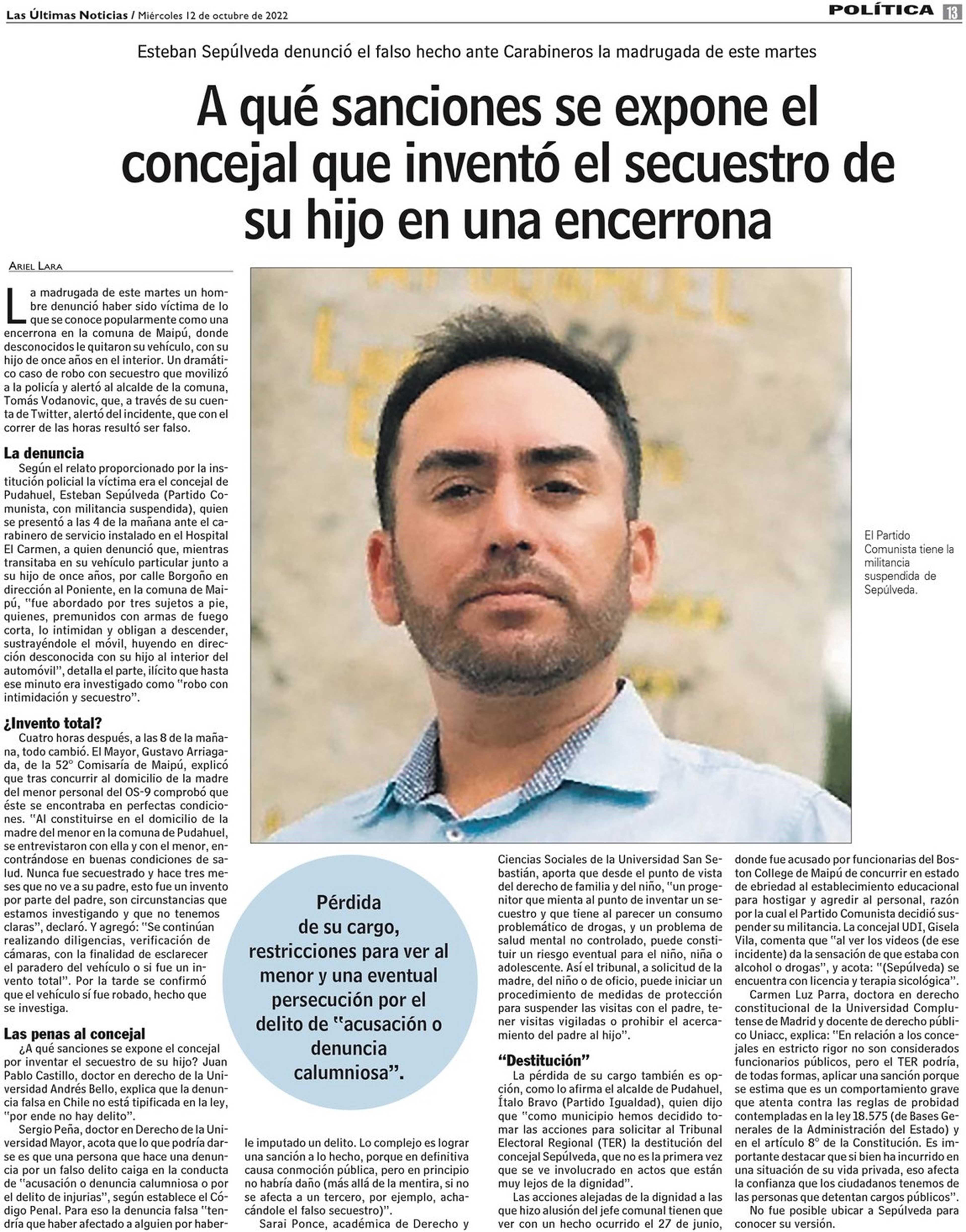 A qué sanciones se expone el concejal que inventó el secuestro de su hijo en una encerrona 12-10-2022 Las Últimas Noticias |