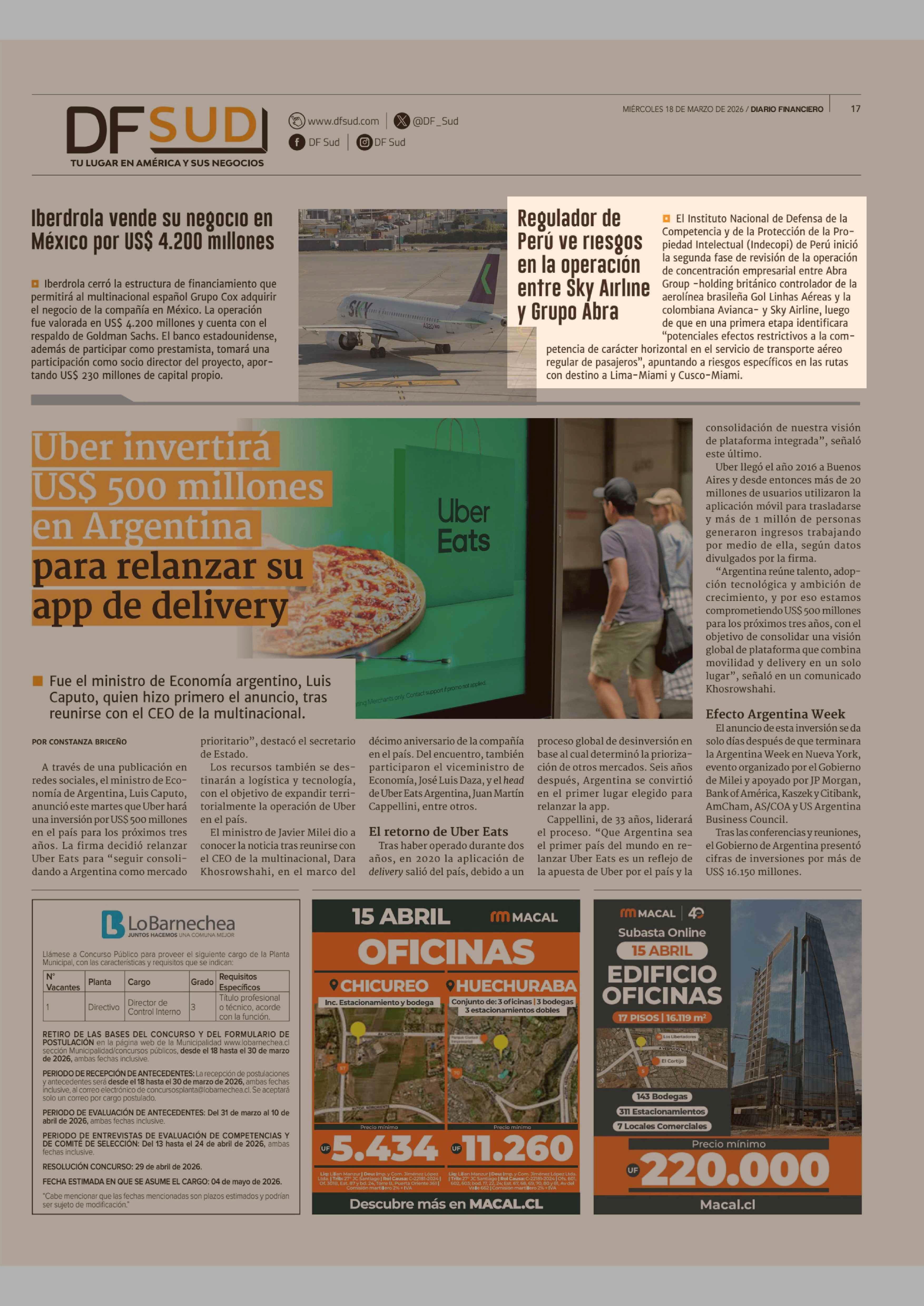Regulador de Perú ve riesgos en la operación entre Sky Airline y Grupo Abra 18-03-2026 Diario Financiero |
