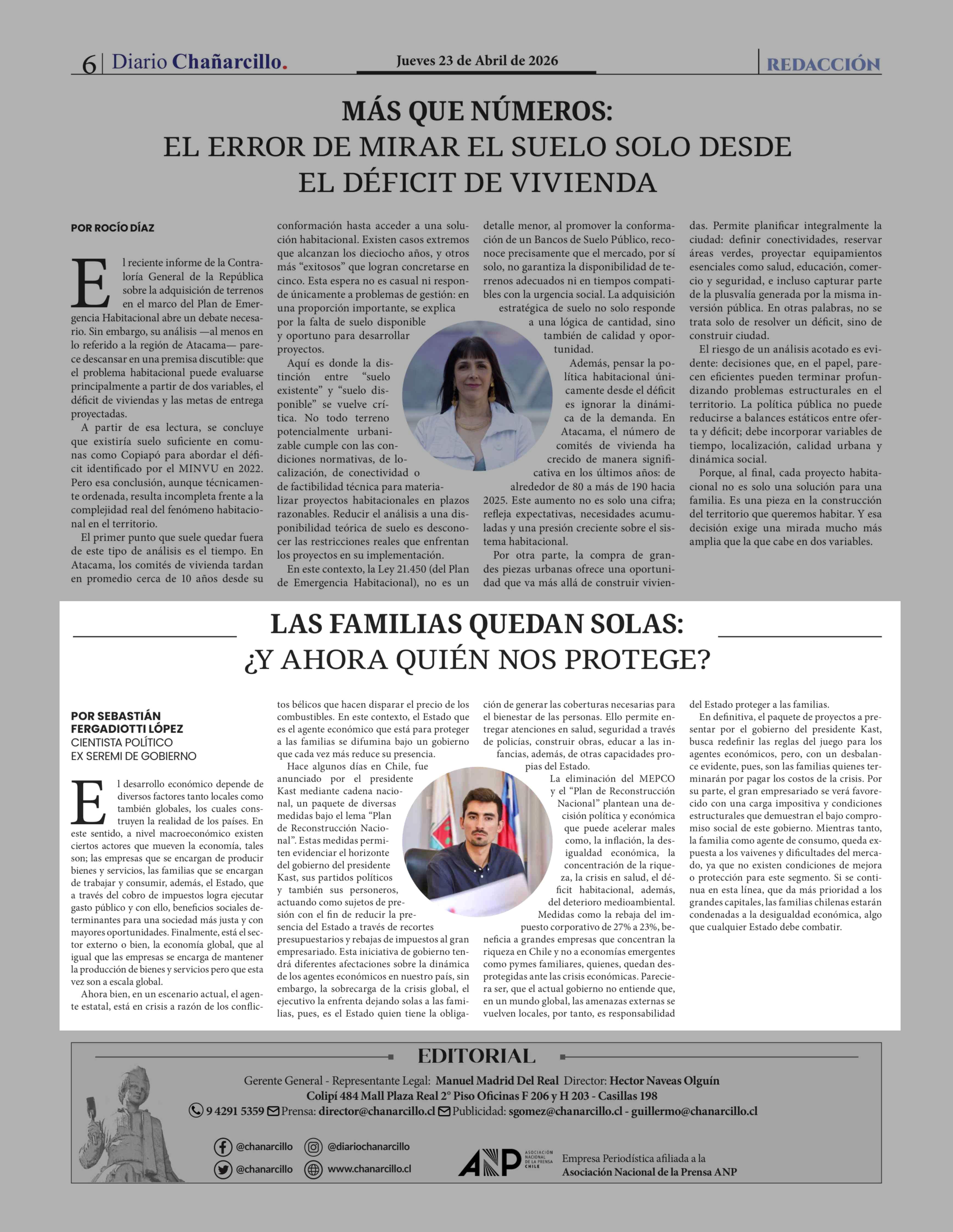 Columnas de Opinión: LAS FAMILIAS QUEDAN SOLAS: ¿Y AHORA QUIÉN NOS PROTEGE? 23-04-2026 Diario Chañarcillo |