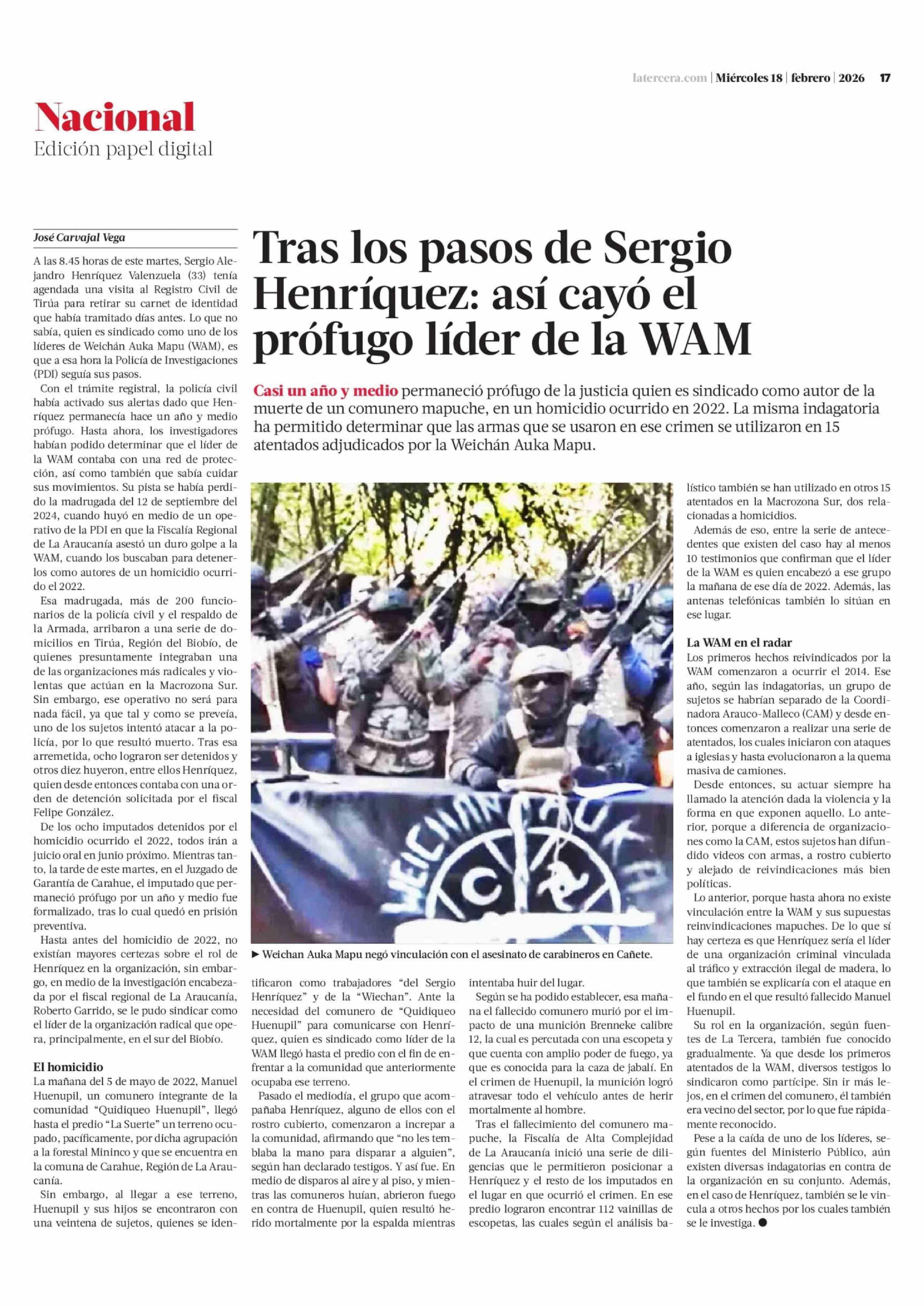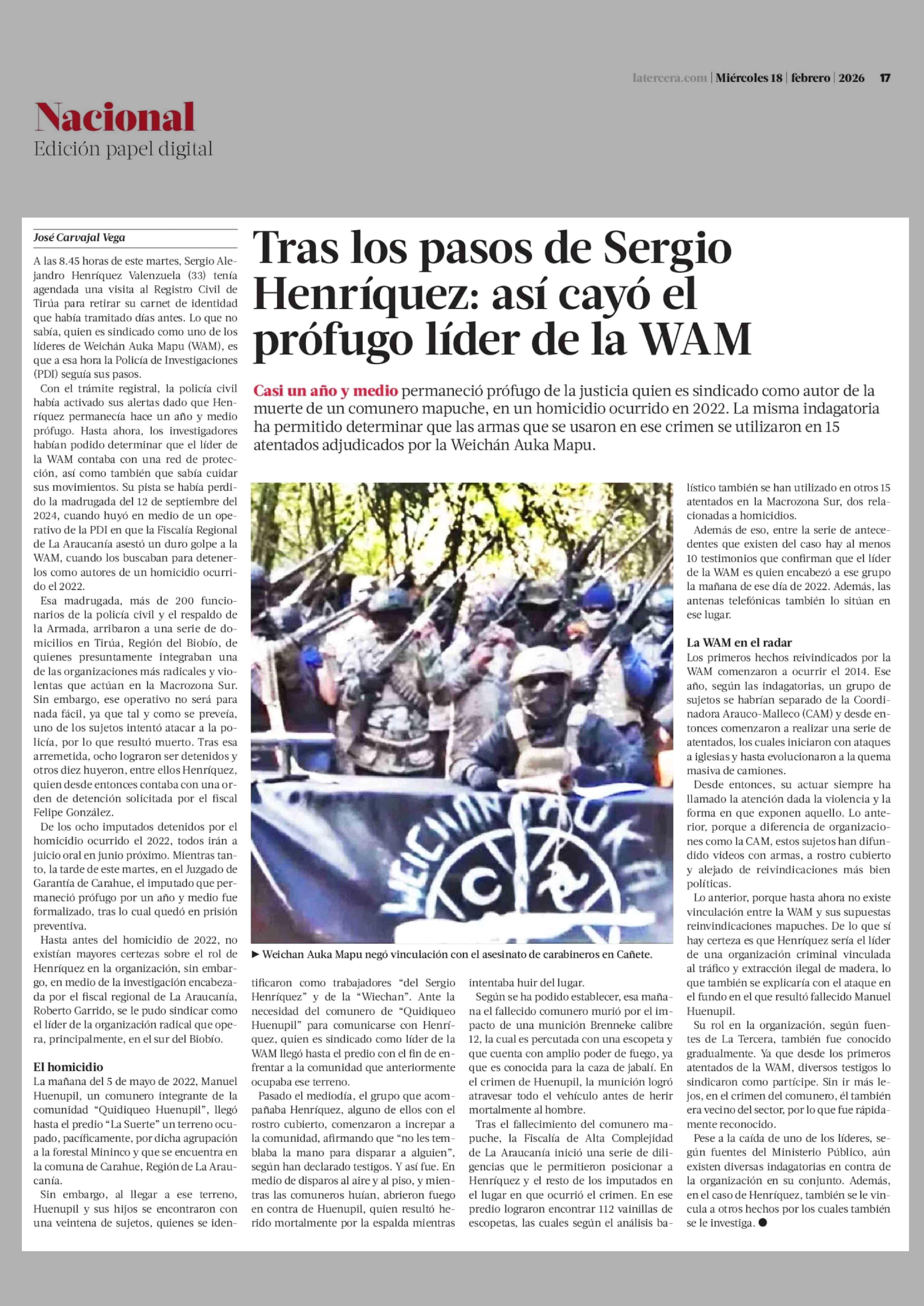 Tras los pasos de Sergio Henríquez: así cayó el prófugo líder de la WAM 18-02-2026 La Tercera |