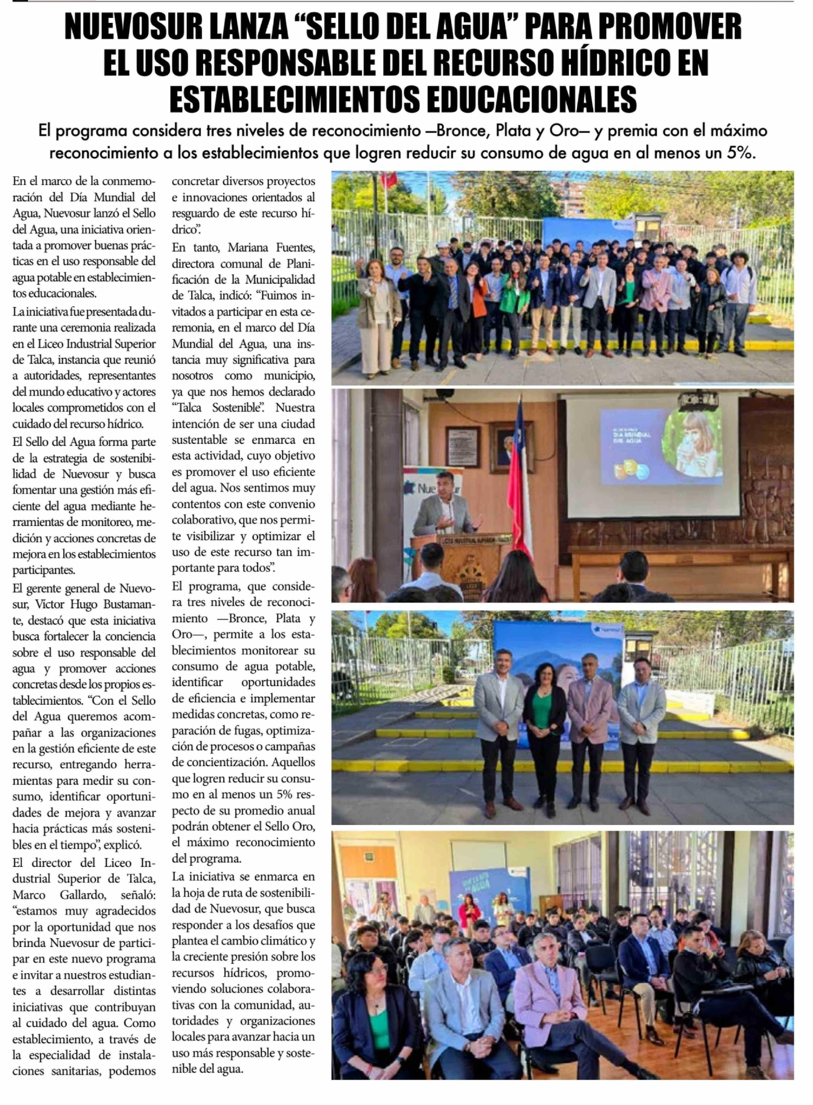 Título: NUEVOSUR LANZA "SELLO DEL AGUA" PARA PROMOVER EL USO RESPONSABLE DEL RECURSO HÍDRICO EN ESTABLECIMIENTOS EDUCACIONALES