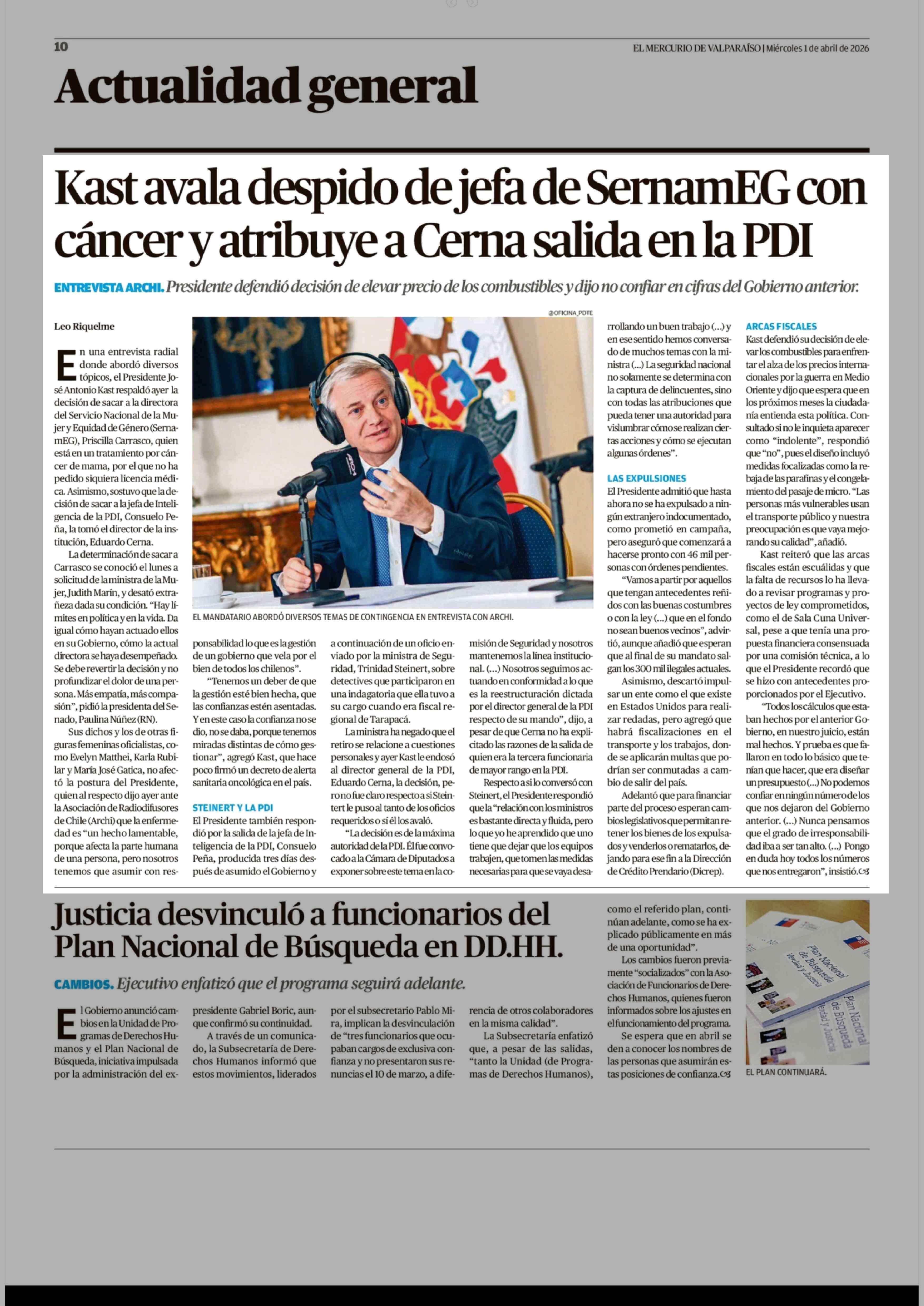 Kast avala despido de jefa de SernamEG con cáncer y atribuye a Cerna salida en la PDI 01-04-2026 El Mercurio de Valparaíso |