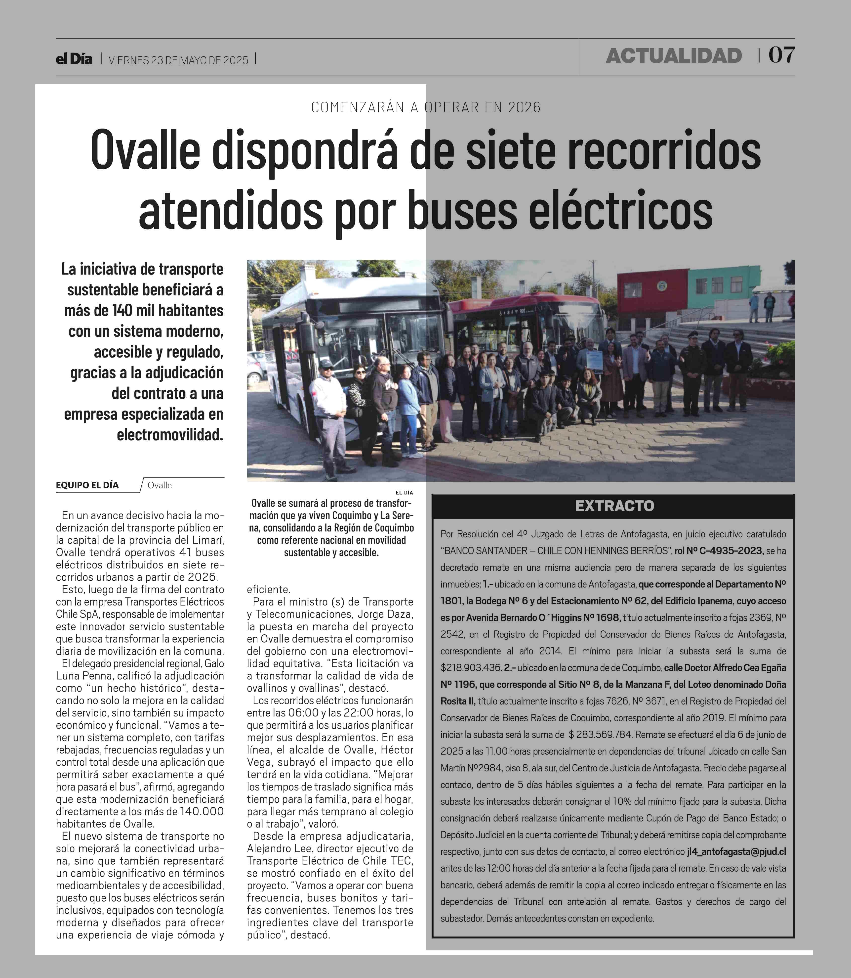 Ovalle dispondrá de siete recorridos atendidos por buses eléctricos 23-05-2025 El Día |