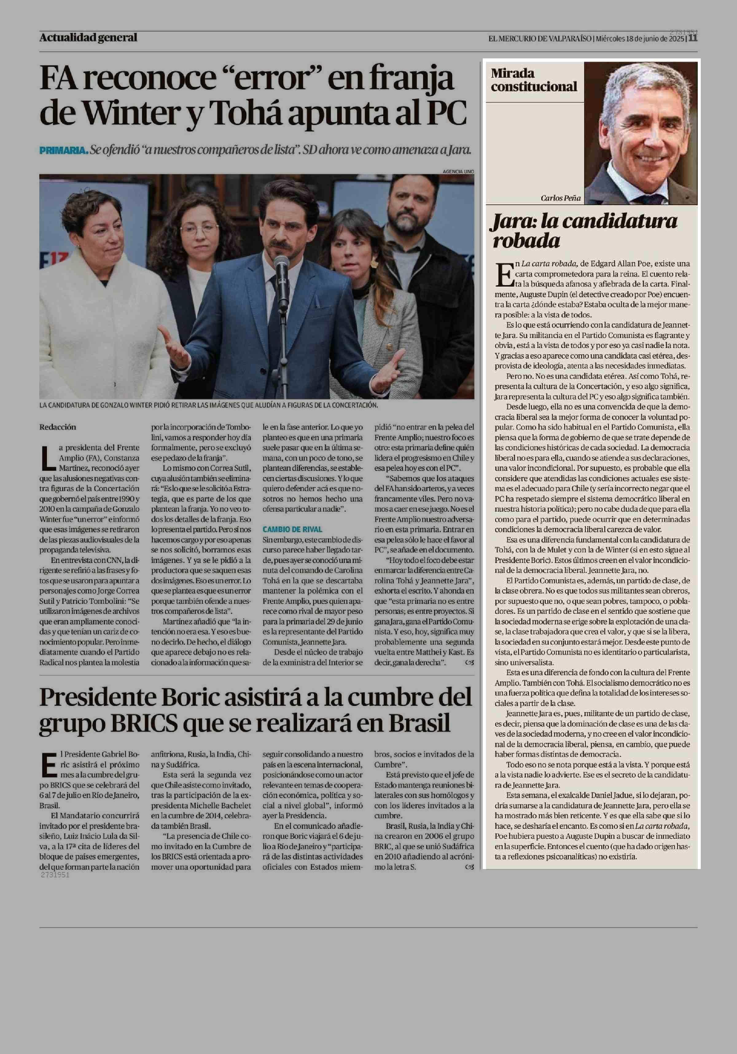 COLUMNAS DE OPINIÓN: la candidatura robada 18-06-2025 El Mercurio de Valparaíso |