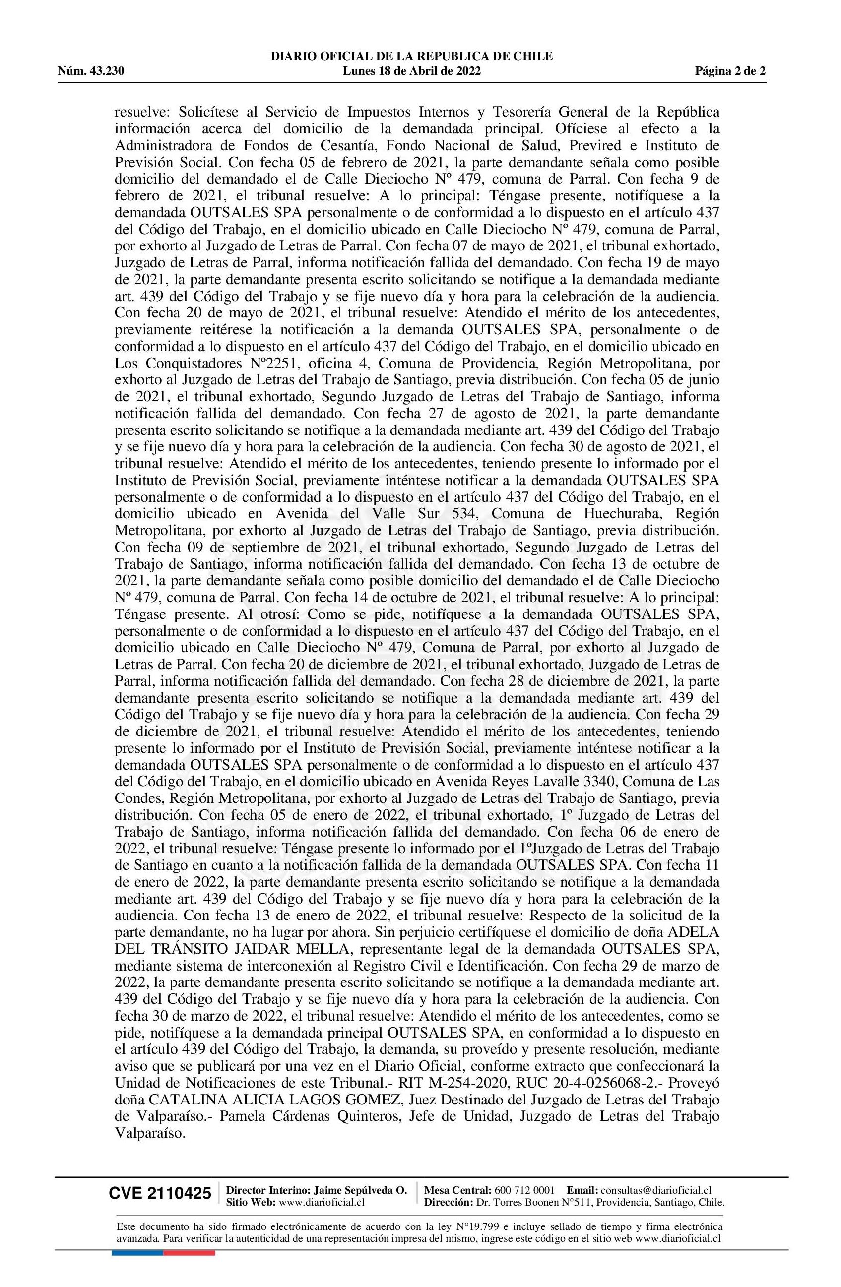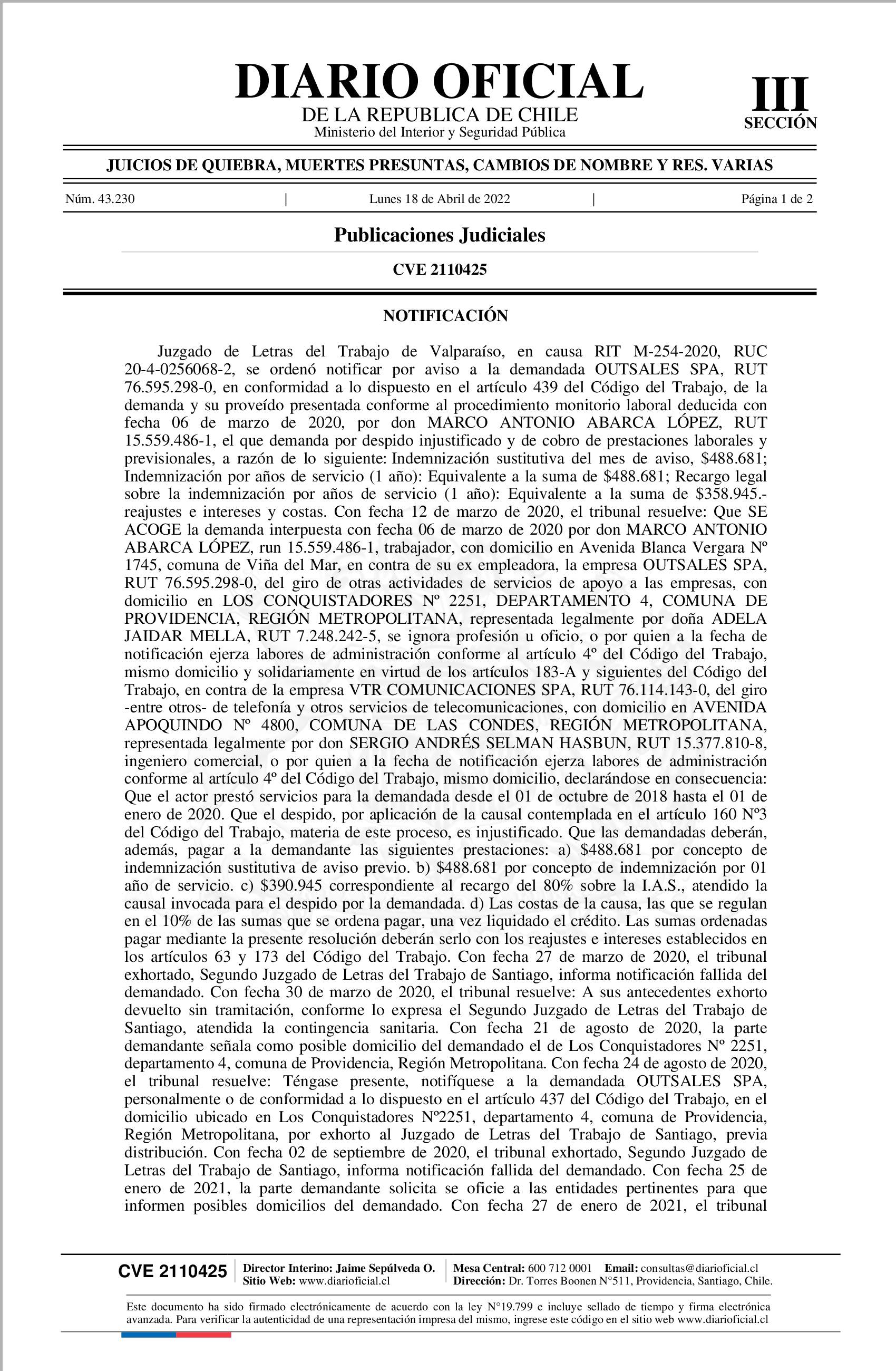 Notificación 18-04-2022 Diario Oficial Edición Electrónica |