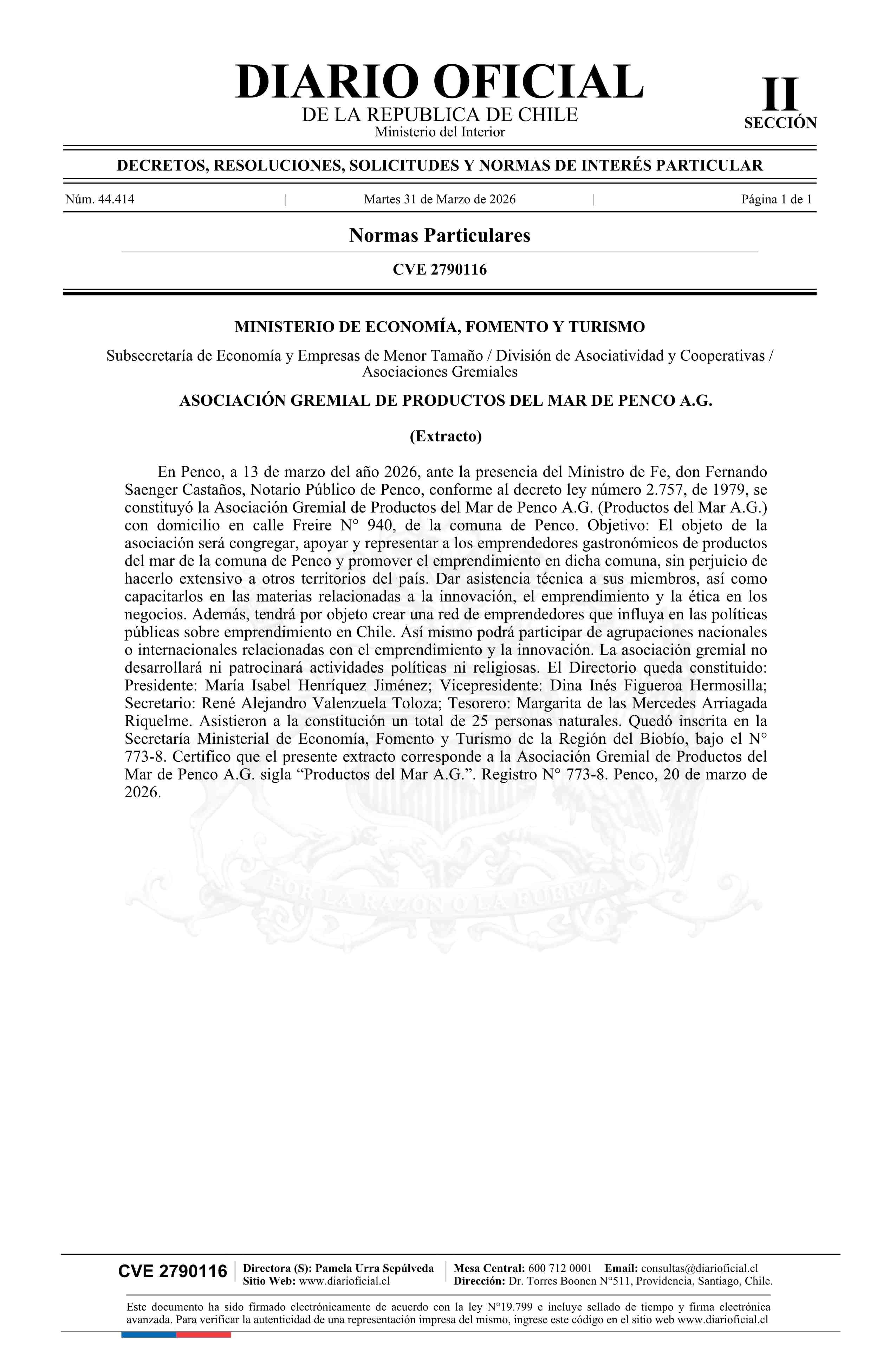 Constitución Asociación Gremial de Productos del Mar de Penco 31-03-2026 Diario Oficial Edición Electrónica |
