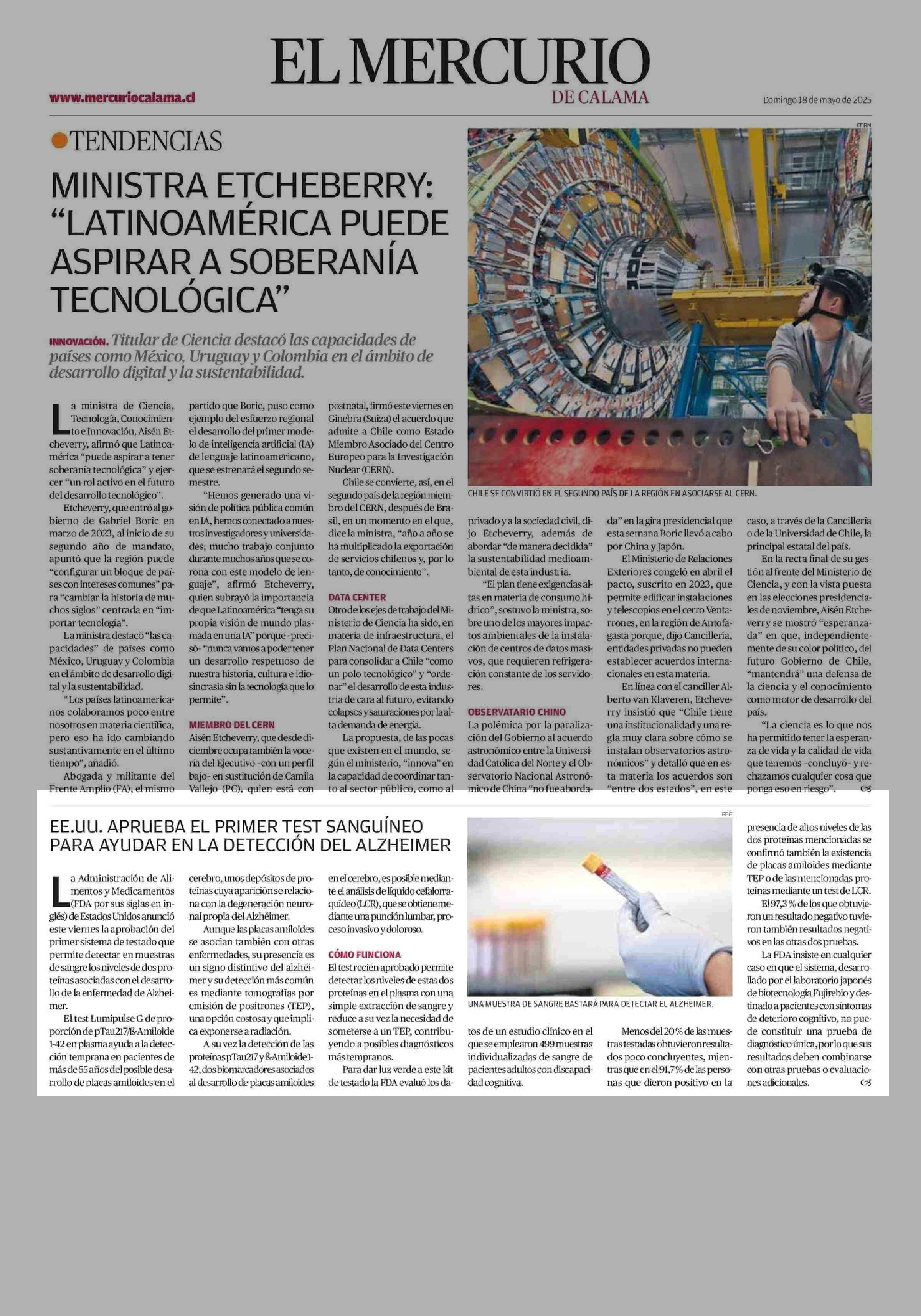 EE.UU. APRUEBA EL PRIMER TEST SANGUÍNEO PARA AYUDAR EN LA DETECCIÓN DEL ALZHEIMER 18-05-2025 El Mercurio de Calama |