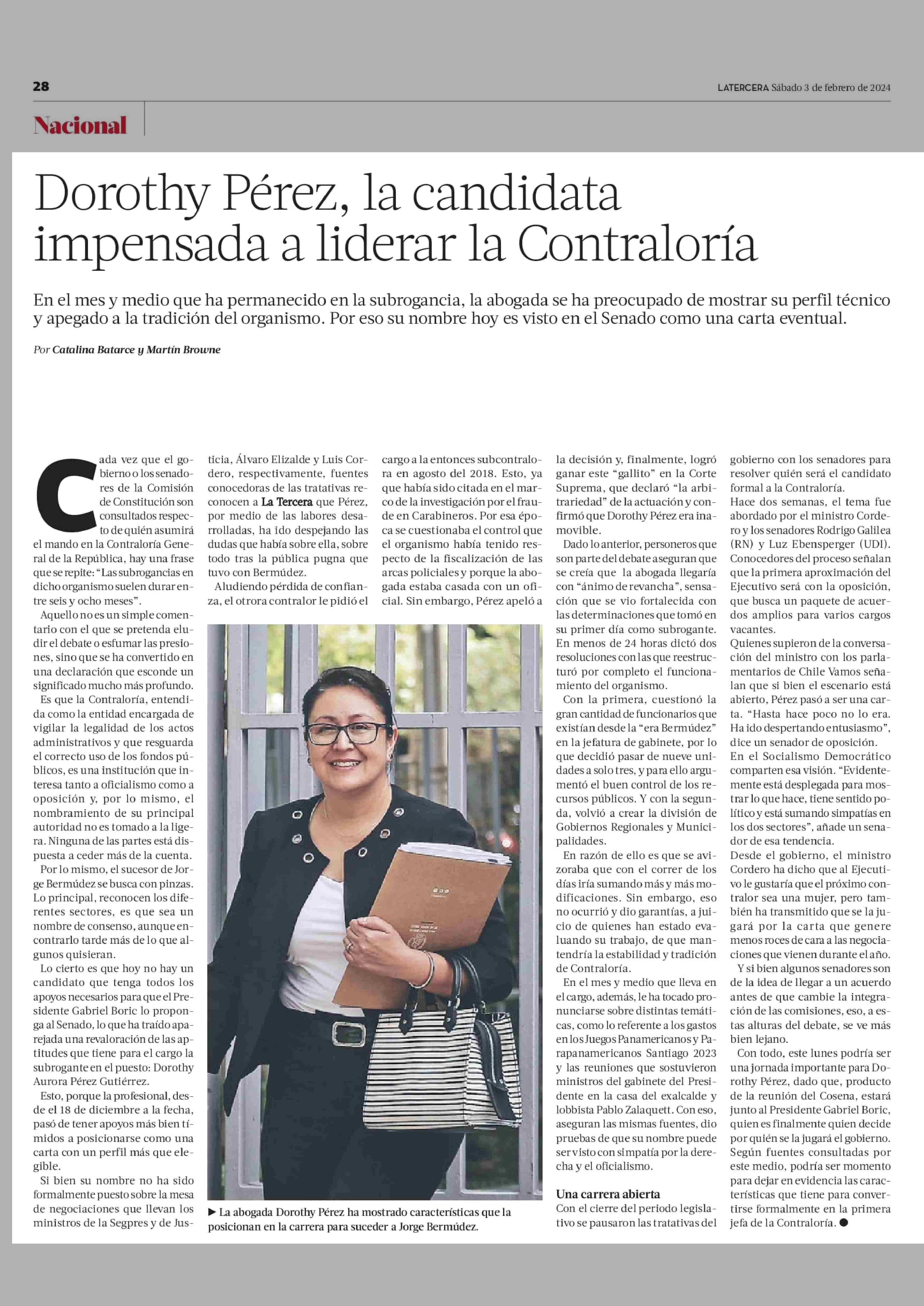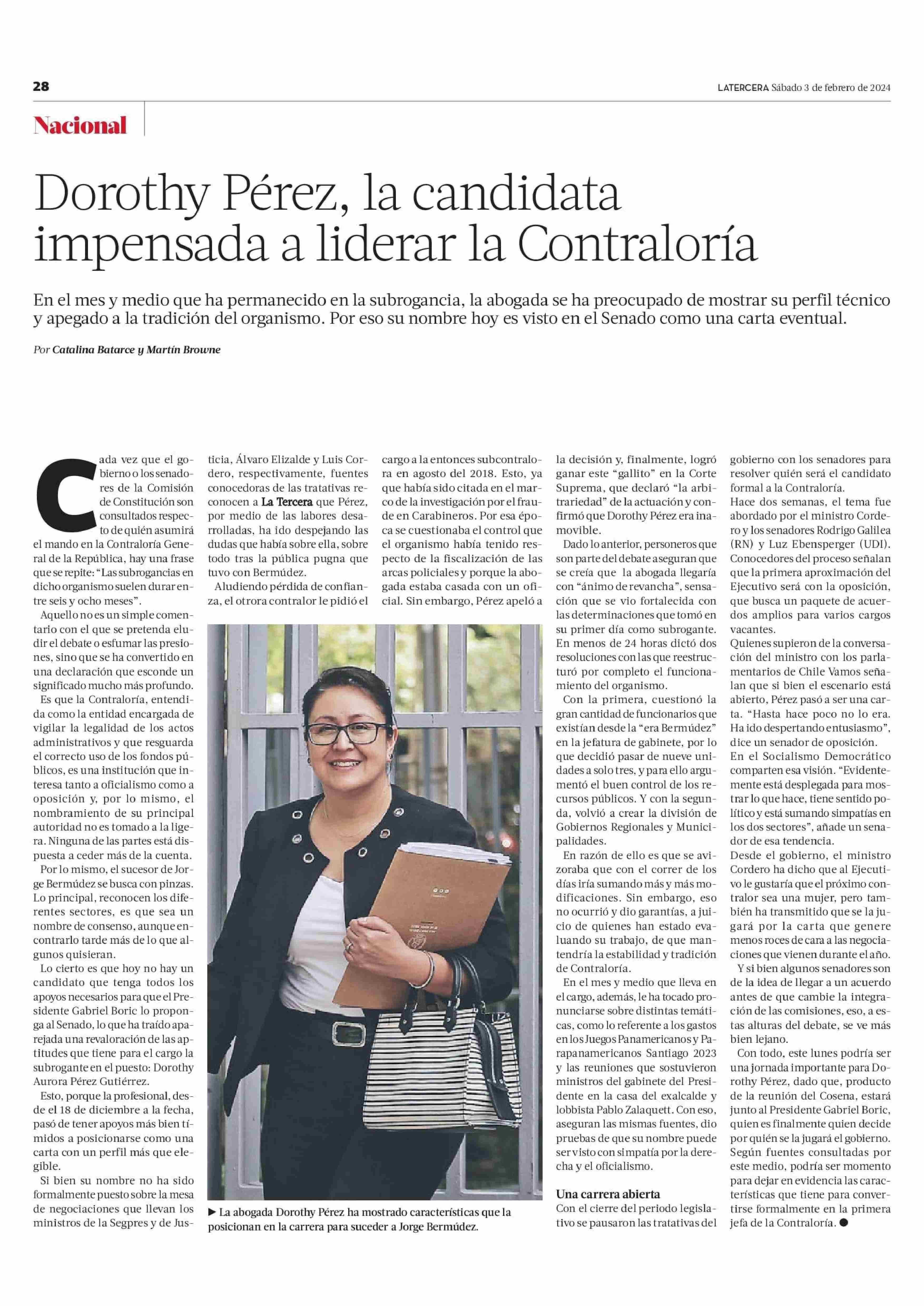 Dorothy Pérez, la candidata impensada a liderar la Contraloría 03-02-2024 La Tercera |
