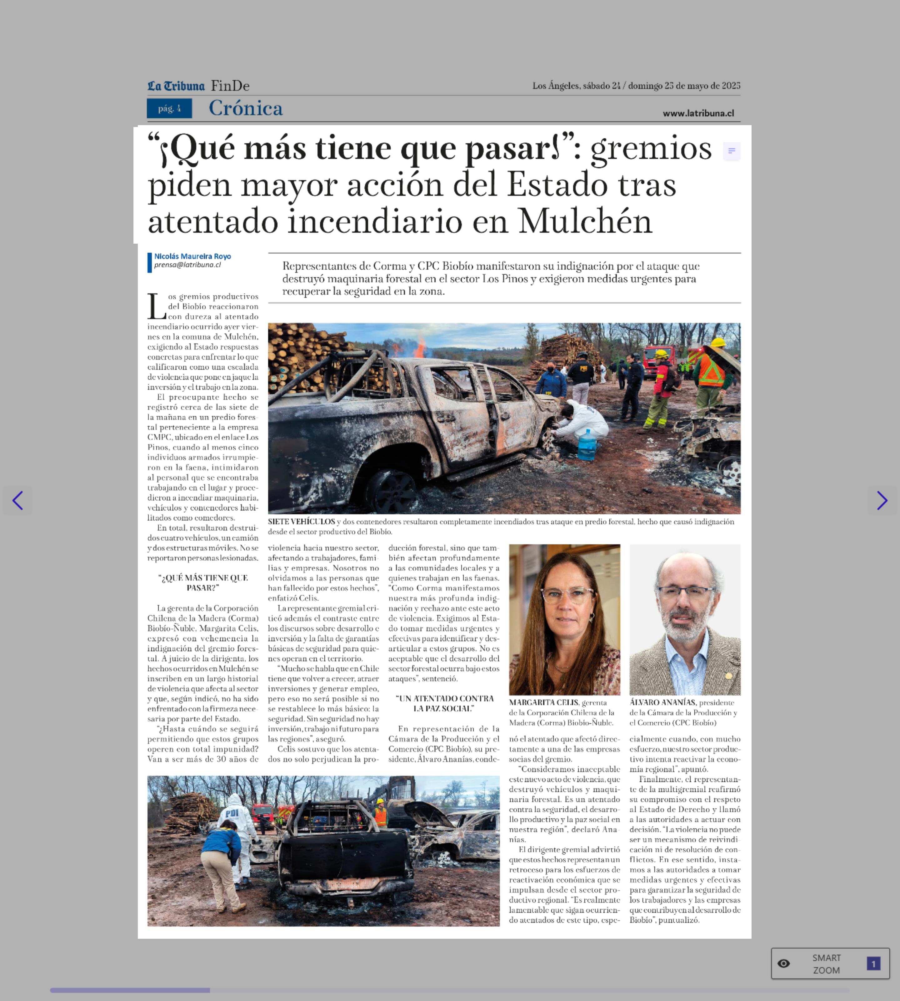 “¿Qué más tiene que pasar?”: gremios piden mayor acción del Estado tras atentado incendiario en Mulchén 24-05-2025 La Tribuna |