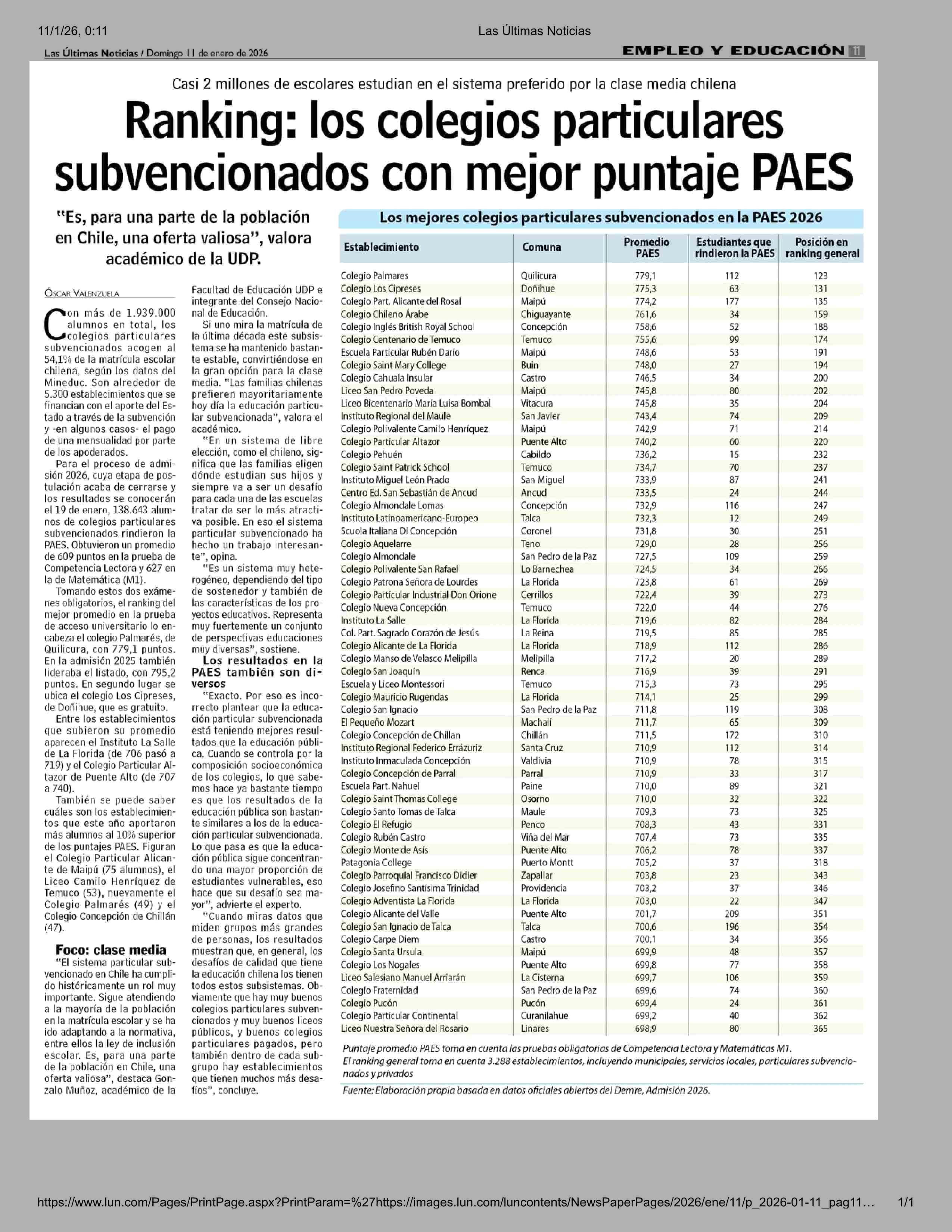 Ranking: los colegios particulares subvencionados con mejor puntaje PAES 11-01-2026 Las Últimas Noticias |