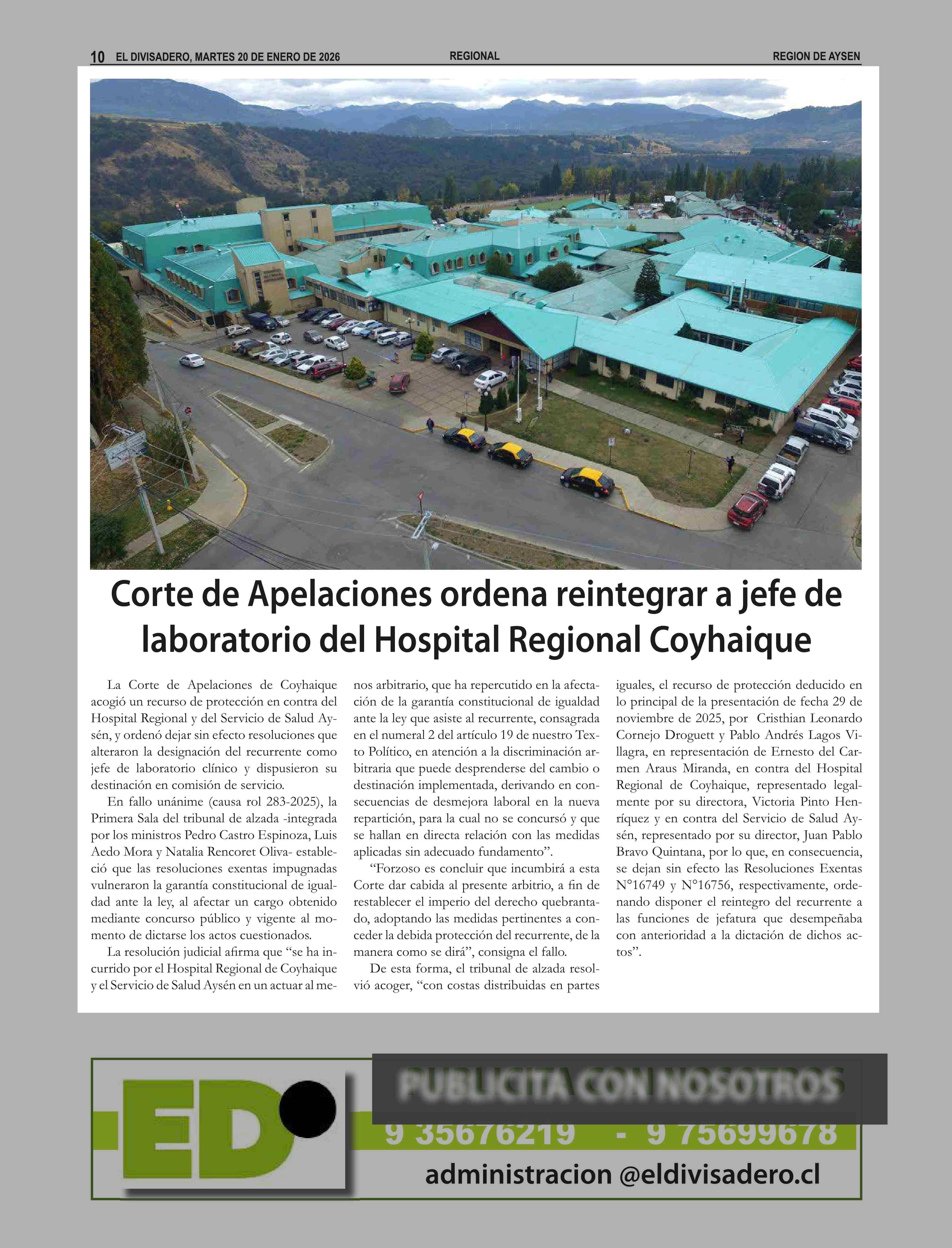 Corte de Apelaciones ordena reintegrar a jefe de laboratorio del Hospital Regional Coyhaique 20-01-2026 El Divisadero |