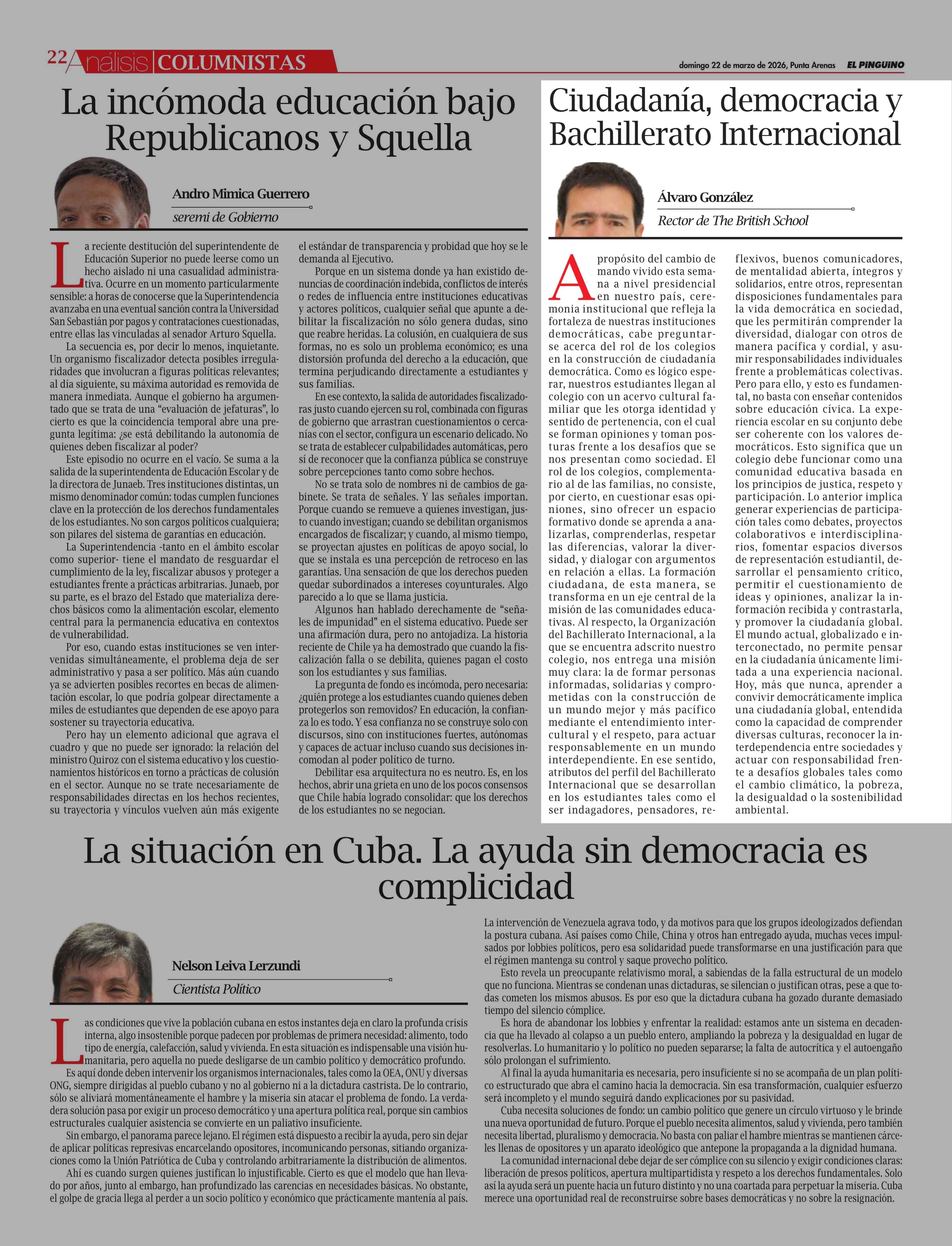COLUMNAS DE OPINIÓN: Ciudadanía, democracia y Bachillerato Internacional 22-03-2026 El Pingüino |