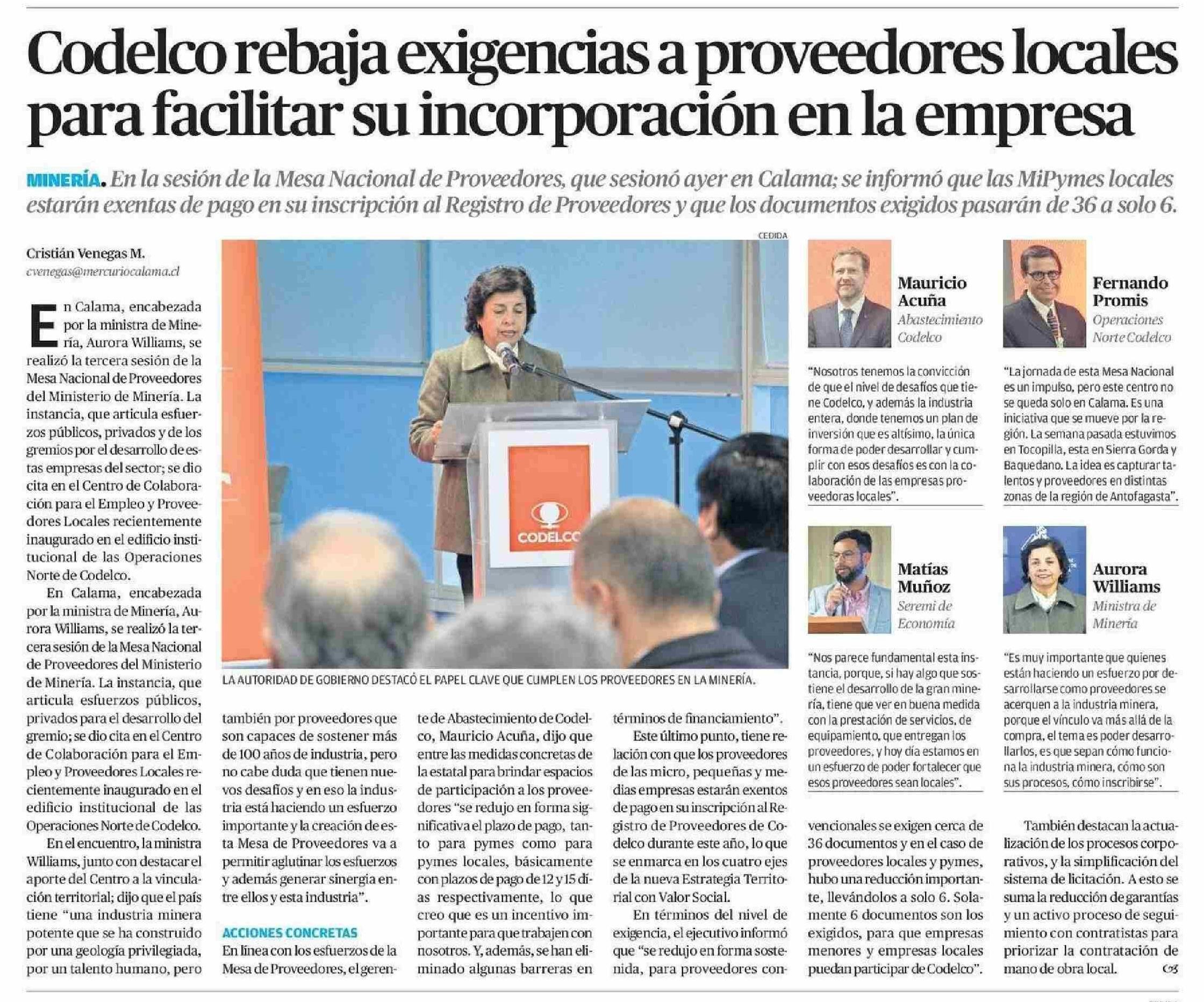 Codelco rebaja exigencias a proveedores locales para facilitar su incorporación en la empresa 12-06-2025 El Mercurio de Antofagasta |