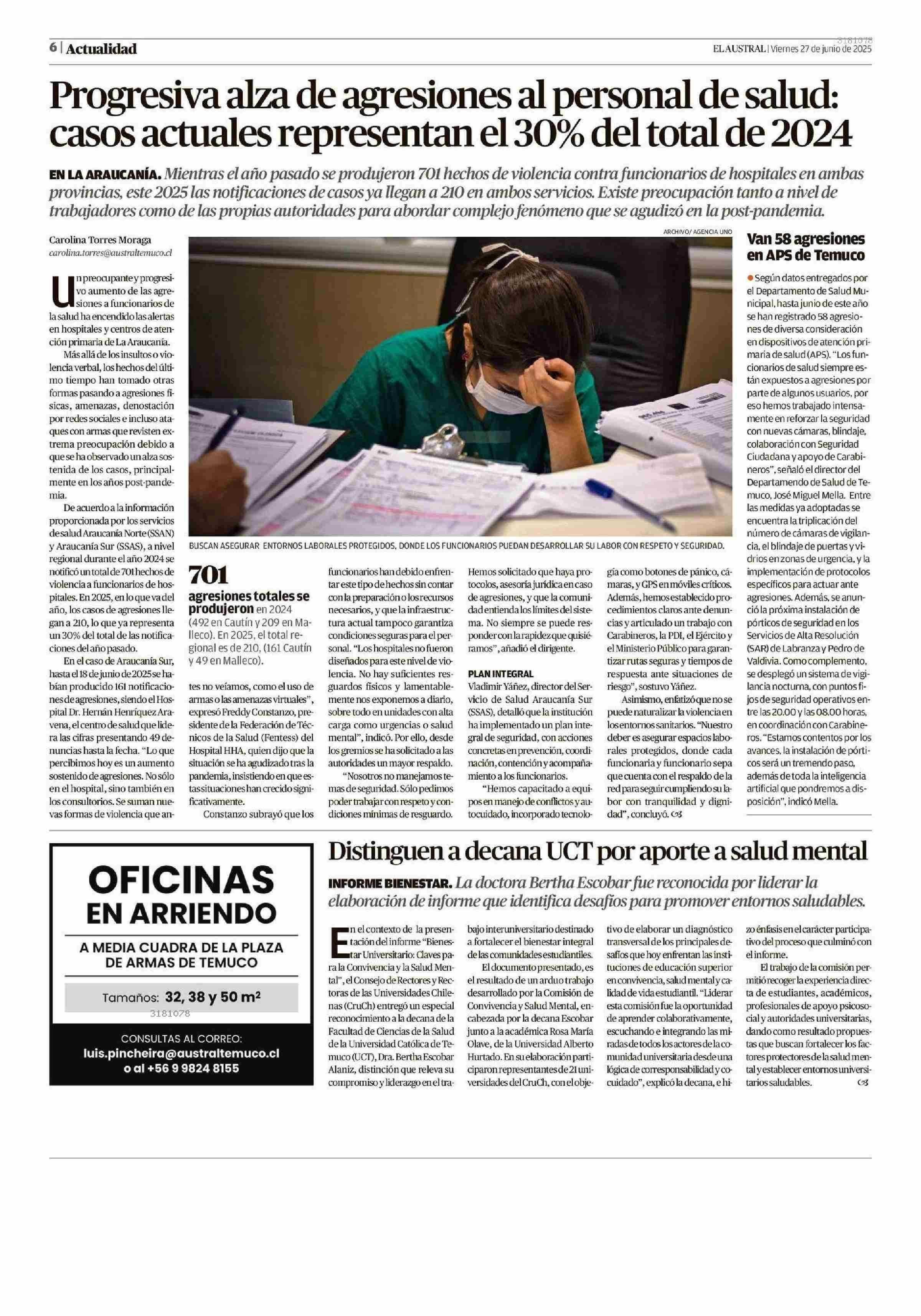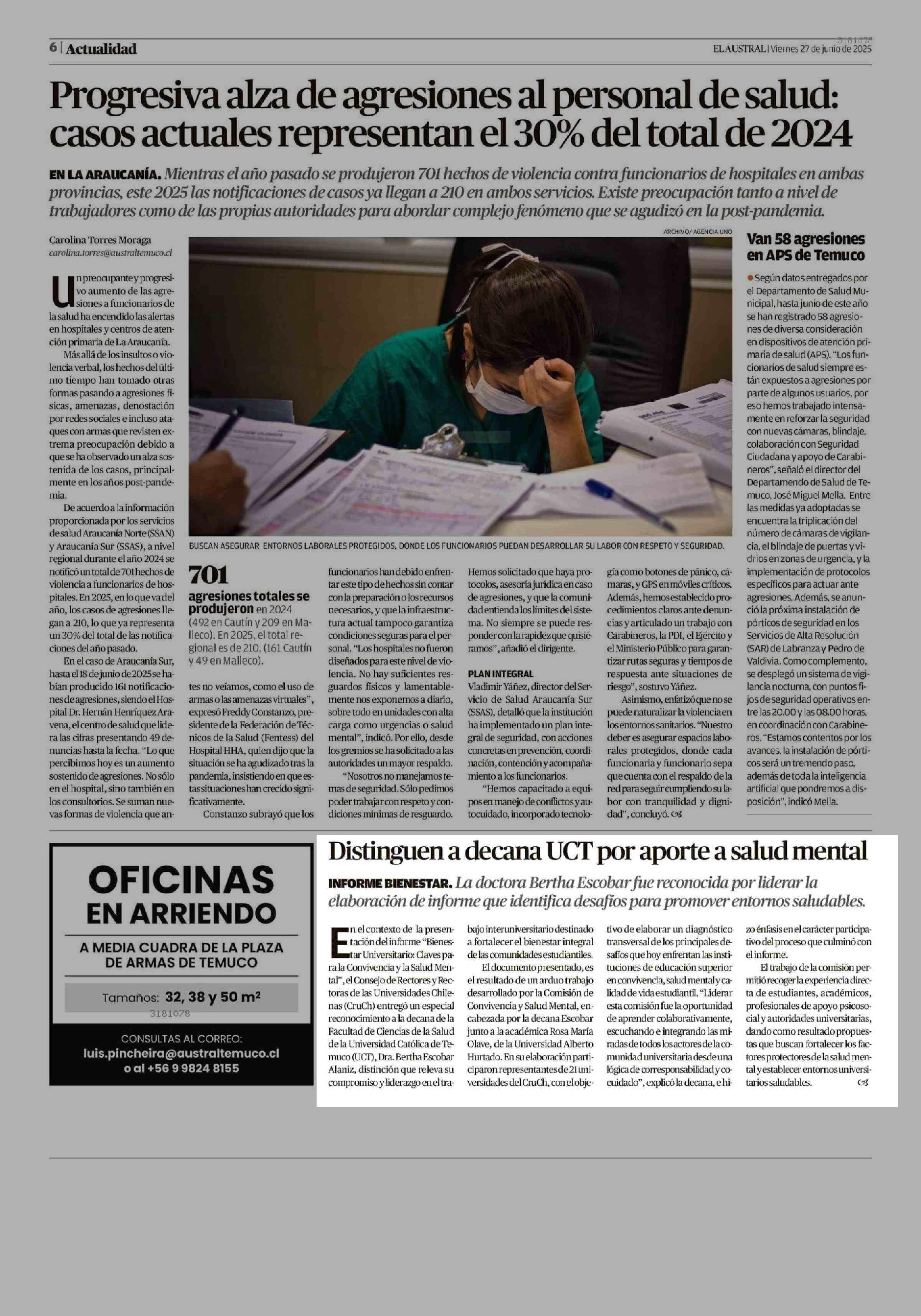 Distinguen a decana UCT por aporte a salud mental 27-06-2025 El Austral de la Araucanía |